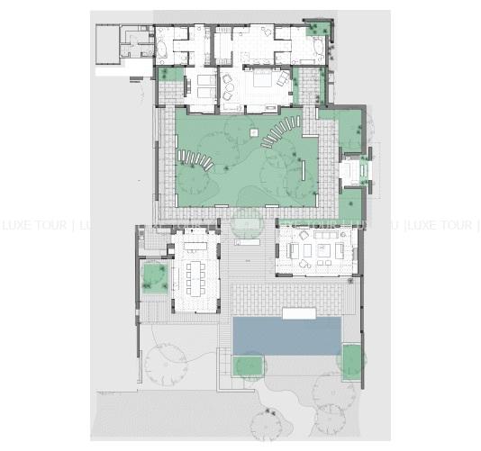 1990 м2. Состоит из двух главных спален и двух дополнительных спален, двух гостиных, кухни, столовой зоны, тренажерного зала, ванных комнат, меблированной террасы, двух бассейнов. Максимальное размещение — 8 человек.