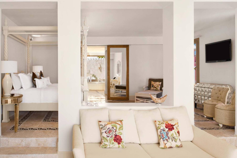 - 100 м2. Состоит из спальни с кроватью king-size или с двумя кроватями queen-size или twin, гостиной, большой гардеробной, ванной комнаты с ванной и «ливневым» душем, душа на открытом воздухе, зоны для спа процедур, террасы с персональным бассейном, павильоном для отдыха с обеденной зоной. 6 номеров с видом на сад и 2 – с видом на лагуну. Максимальное размещение – 3 человека, при соединении с Junior Suite – 5 человек.
