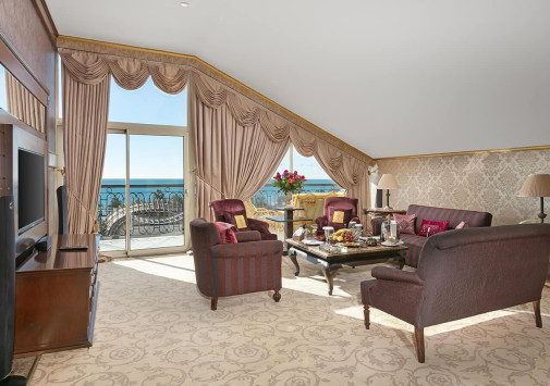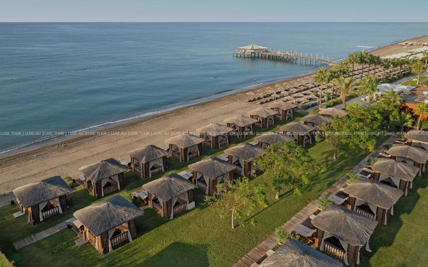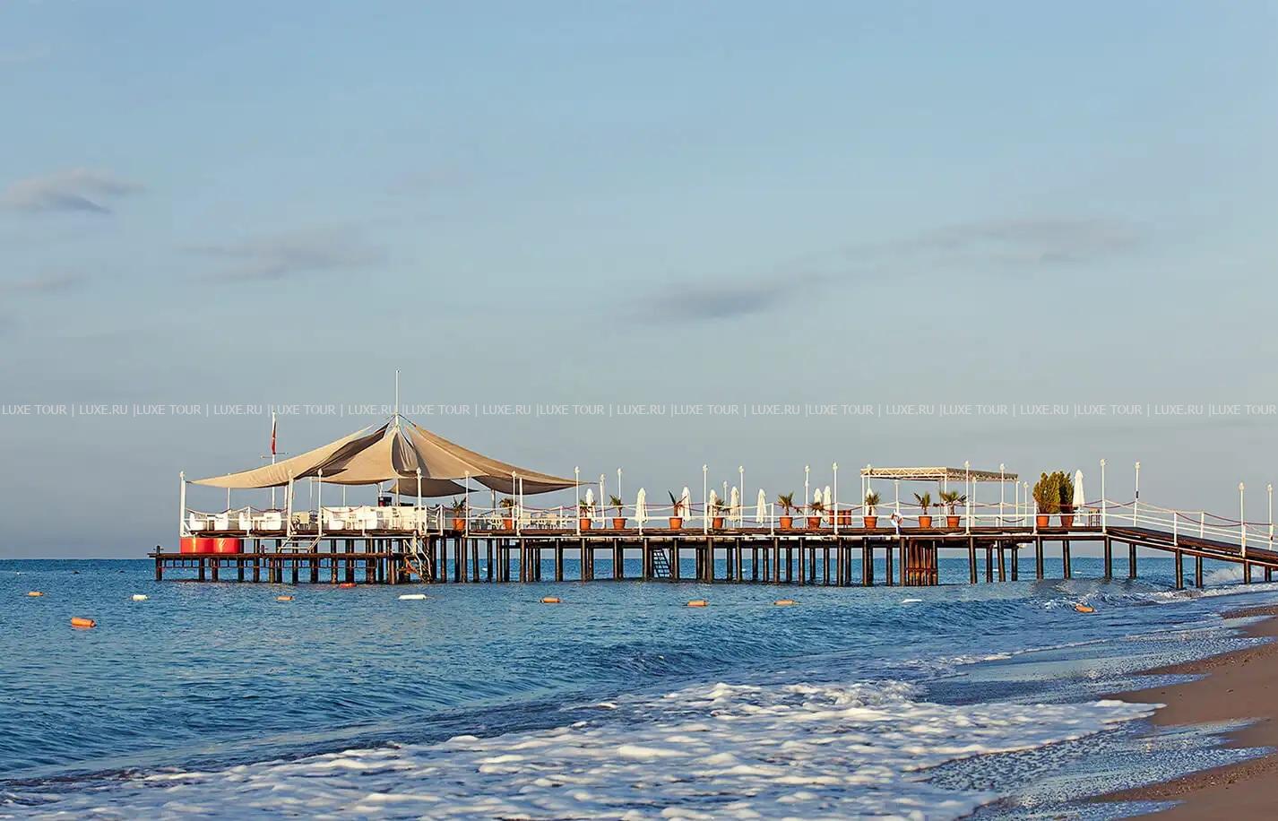 Отель располагает оборудованным песчано-галечным пляжем шириной 50 м и протяженностью 300 м – с пирсом, детским бассейном с морской водой, семейной зоной для отдыха с детьми, отдельной зоной для взрослых и зоной с VIP-павильонами.