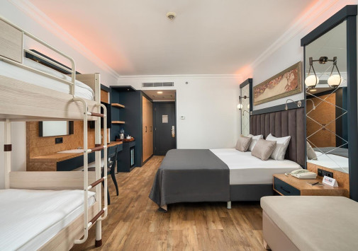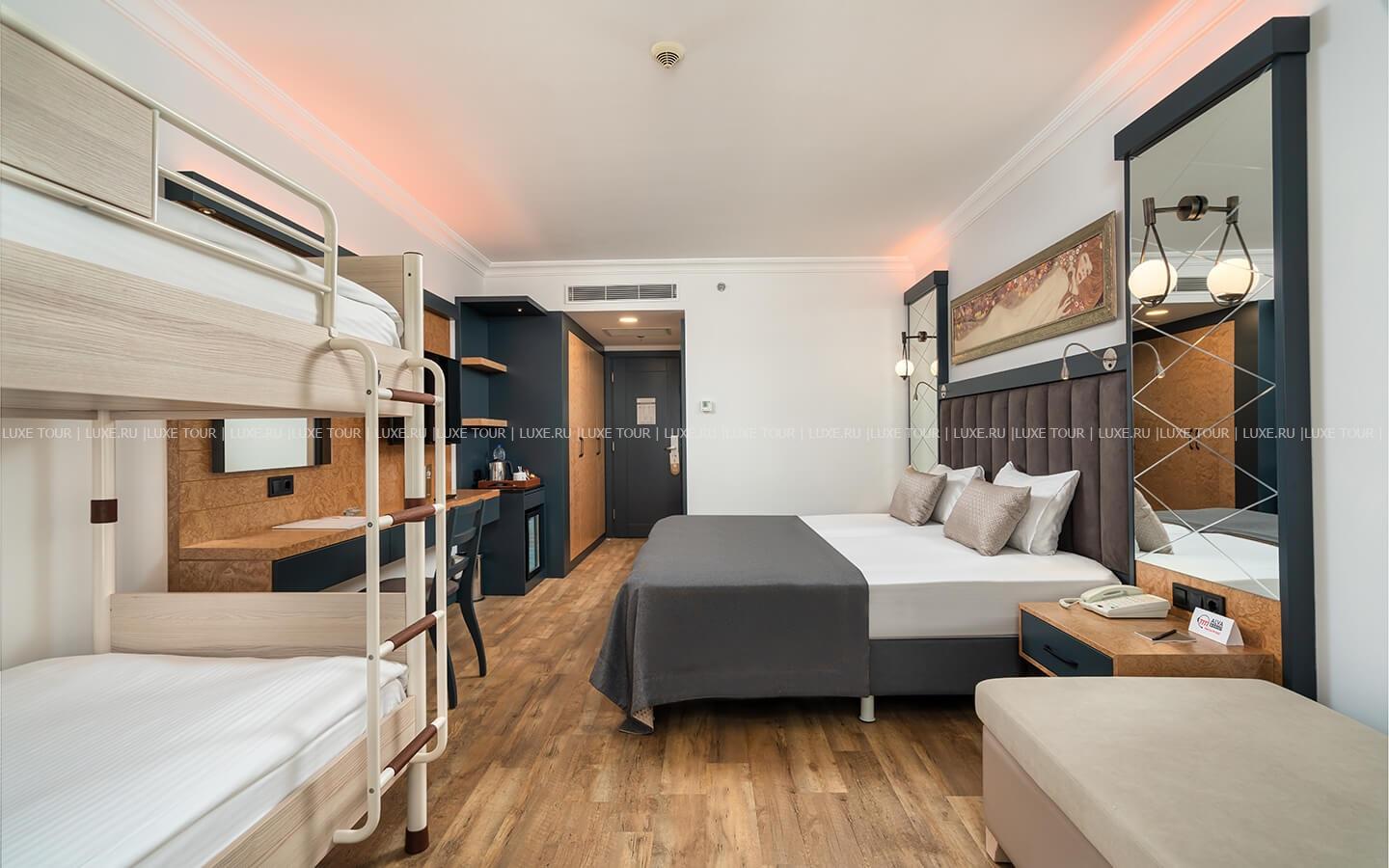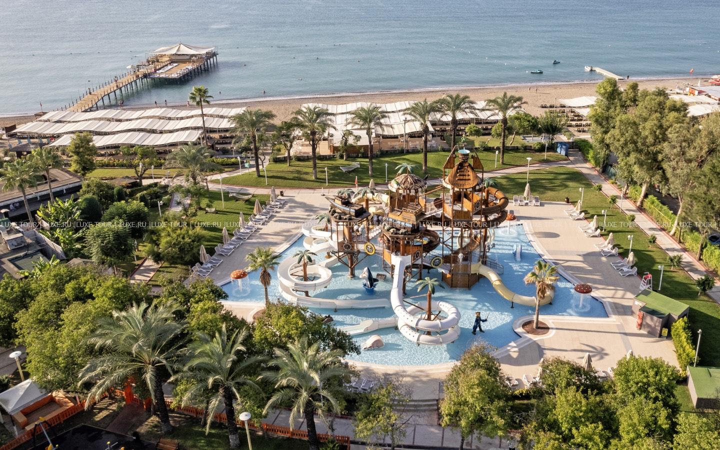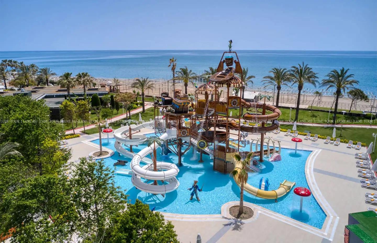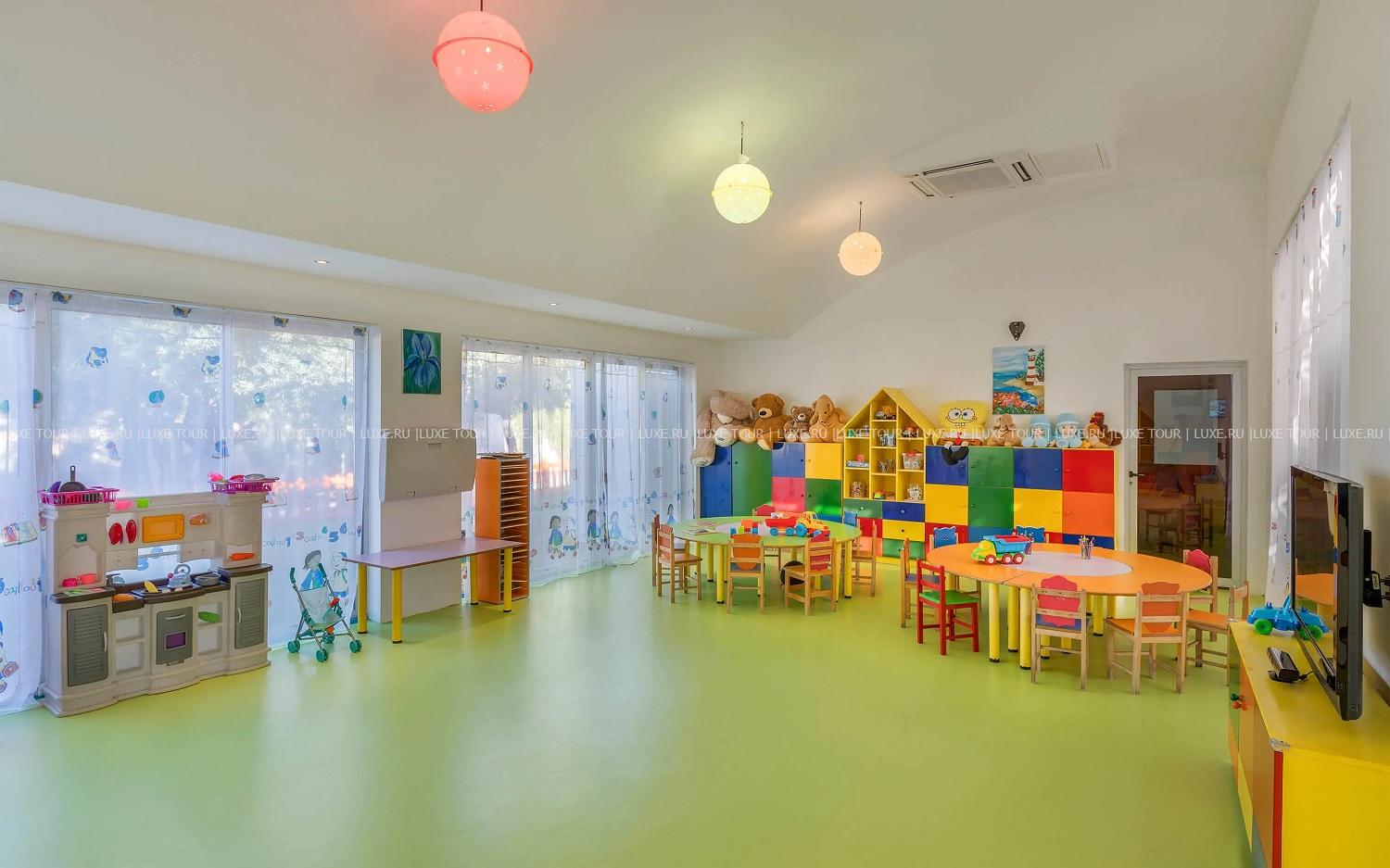 В отеле имеются детский бассейн с морской водой на пляже, открытый подогреваемый бассейн в мини-клубе, аквапарк с водными горками и аттракционами, крытый детский бассейн, открытый и крытый детские бассейны Deluxe. В мини-клубе для детей 4-12 лет с игровыми комнатами и игровой площадкой предлагается разнообразие развлекательных, творческих и познавательных мероприятий. Также в номерах предусмотрены удобства для проживания с детьми, в ресторанах есть детское меню, возможны услуги няни (по запросу).