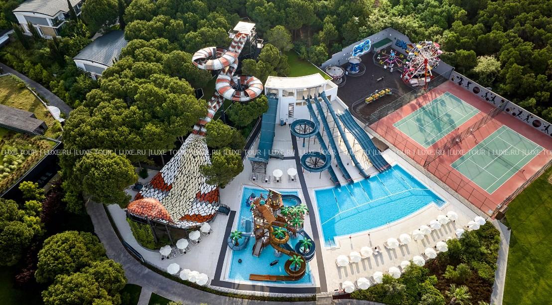 На территории отеля находятся: главный бассейн площадью 1800 м² (с детской секцией), бассейн Garden с подогревом, бассейн для взрослых, 2 крытых бассейна, включая детский бассейн, открытые бассейны в районе вилл Laguna, а также аквапарк с водными горками для взрослых и детей.