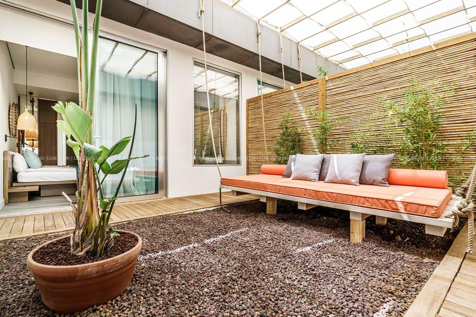 Отель располагает частным оборудованным пляжем-платформой.