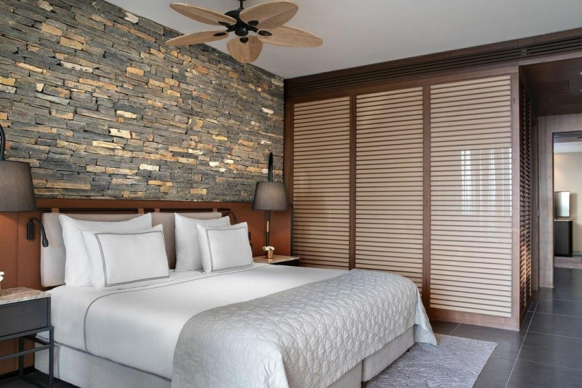 - 60 м2. Состоит из спальни с кроватью king-size или двумя односпальными кроватями и отделенной шторой зоны отдыха с диваном, ванной комнаты с душем, террасы с зоной отдыха, доступом в бассейн, общий с соседними номерами, и видом на море. Максимальное размещение – 3 человека.