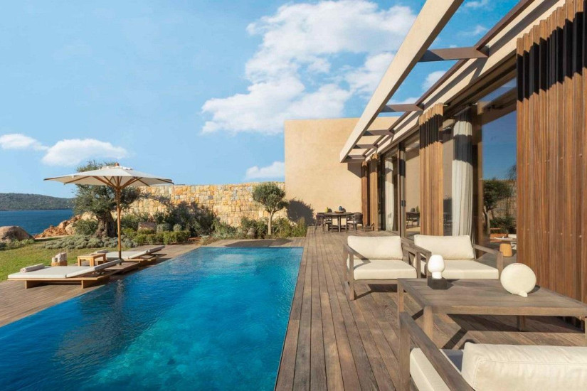 - 350-550 м2. Двухуровневая вилла с современным дизайном и открытой планировкой состоит из трех спален (две с кроватью king-size и одна с двумя кроватями twin), гостиной, обеденной зоны, мини-кухни, гардеробных, трех ванных комнат, балкона с зоной отдыха, частного сада, просторной террасы с подогреваемым бассейном, зоной отдыха, обеденной зоной и видом на море. Максимальное размещение – 6 человек.