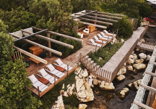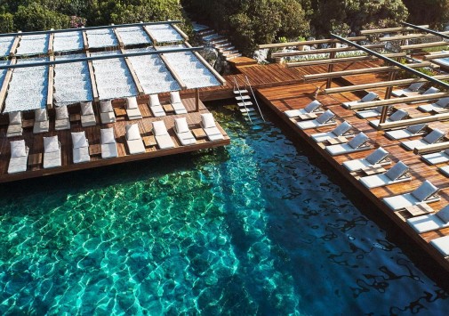 Отель располагает пляжем на деревянной платформе.