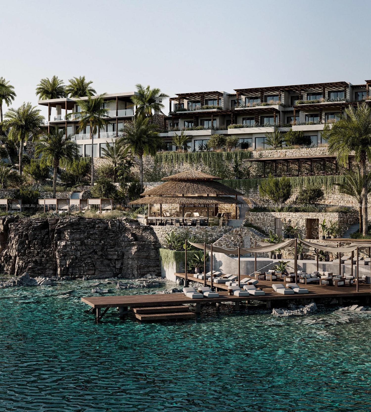 78 м2. Состоит из спальни с кроватью king-size, гостиной, гардеробной, ванной комнаты открытого плана с ливневым душем и ванной с видом на море, террасы с бассейном, зоной отдыха и видом на море. Максимальное размещение – 2 человека.