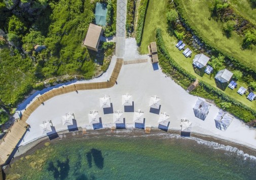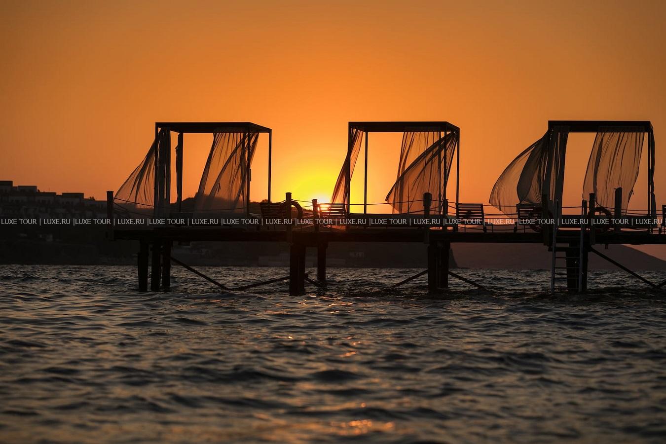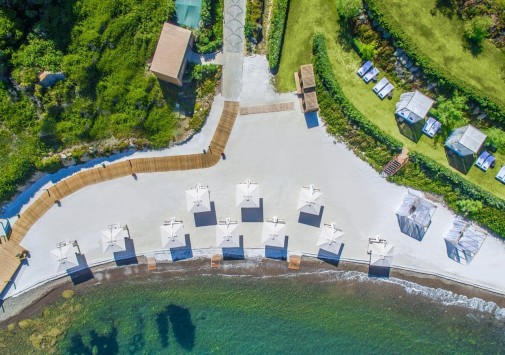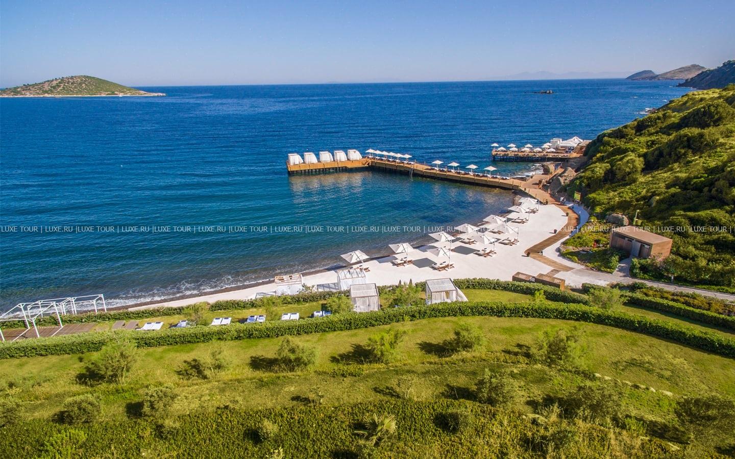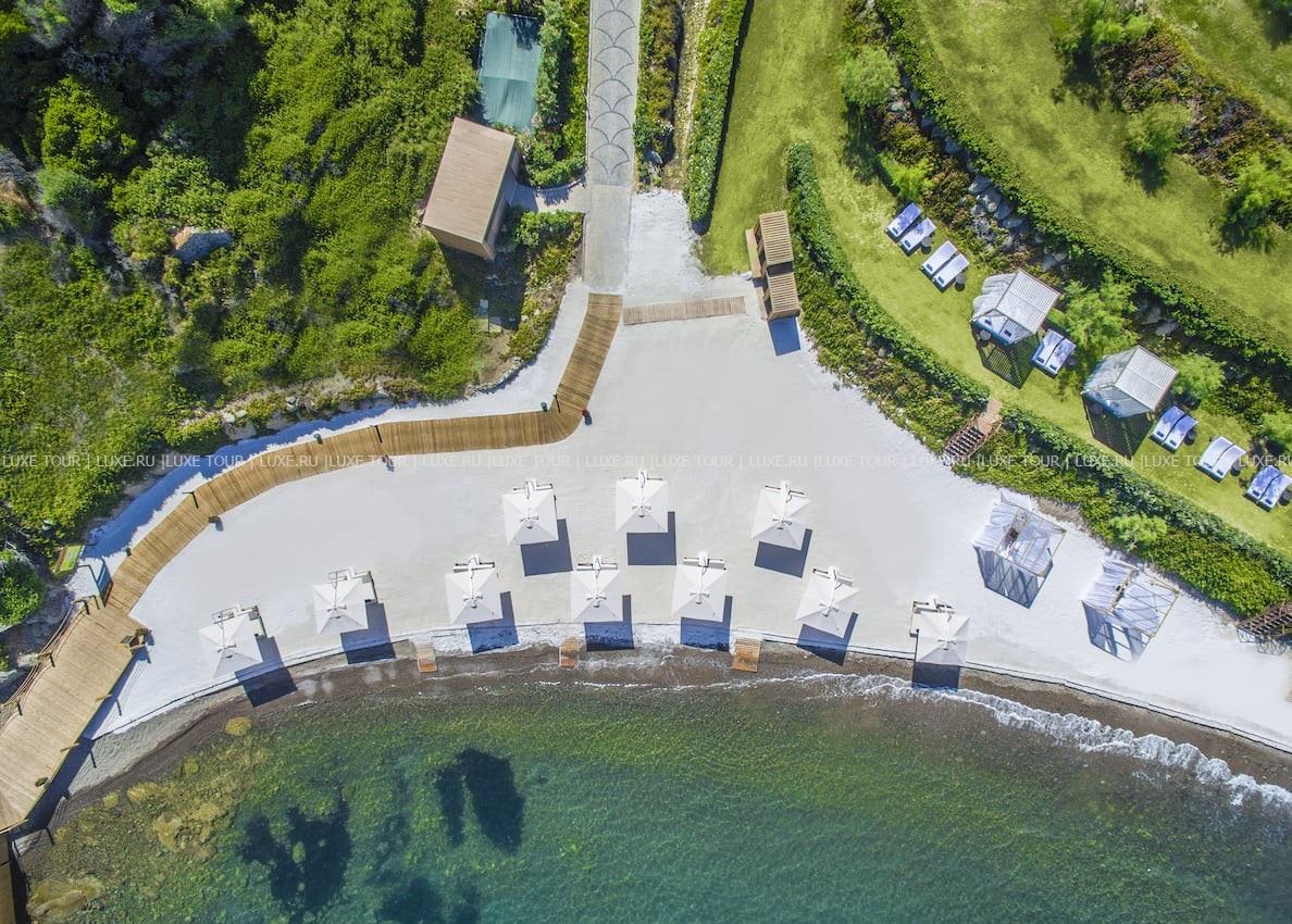 Отель располагает оборудованным песчаным пляжем в частной бухте и двумя пирсами (300 м2 и 400 м2) с шезлонгами, зонтиками и шатрами.