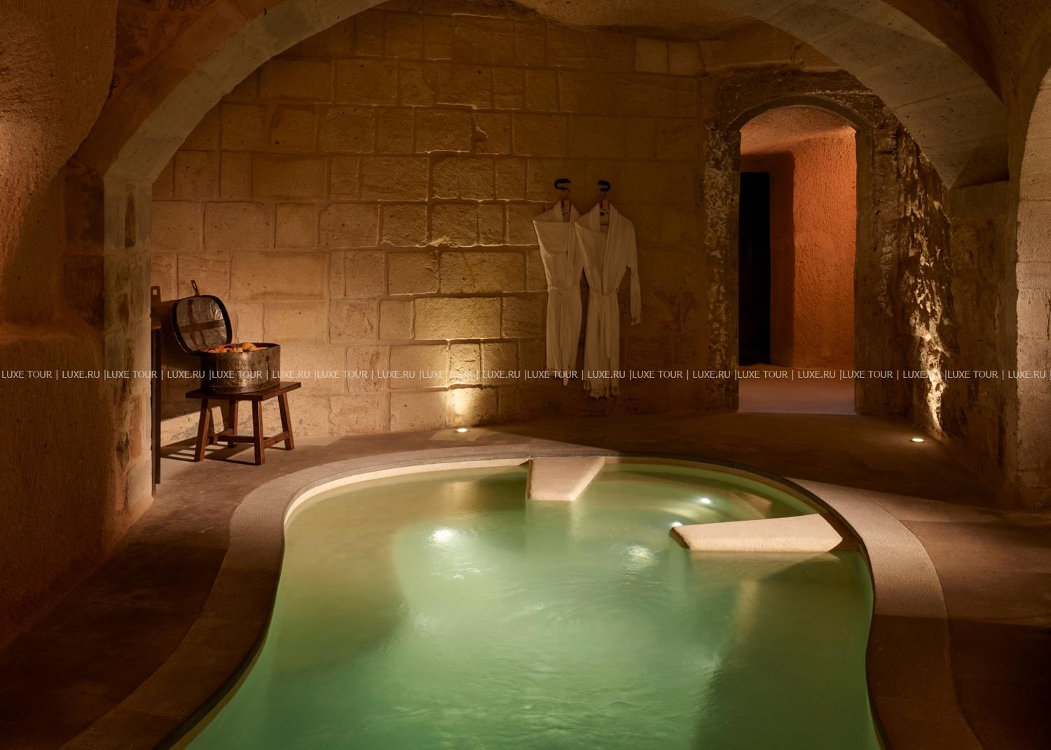 Spa-центр с крытым спа-бассейном, зоной отдыха и процедурным кабинетом, расположенными под древними сводами, предлагает разнообразие услуг по уходу за телом и лицом, основанных на местных традициях и использовании натуральных растительных продуктов региона и инновационных косметических средств швейцарского бренда Valmont.