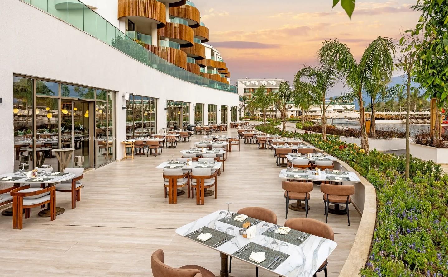 - Главный ресторан Myra, открытый для завтраков, обедов и ужинов, впечатляет разнообразием блюд международной кухни на «шведском столе». В ресторане также предусмотрен детский уголок.