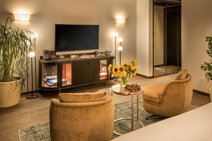 кондиционер, телевизор с плоским экраном, телефон, бесплатный Wi-Fi, сейф, мини-бар, набор для приготовления чая и кофе, включая кофеварку Nespresso и традиционный чай Cha-do, утюг и гладильная доска, в ванной комнате с отделкой из мрамора – душ, фен, туалетная косметика, халаты, тапочки.
