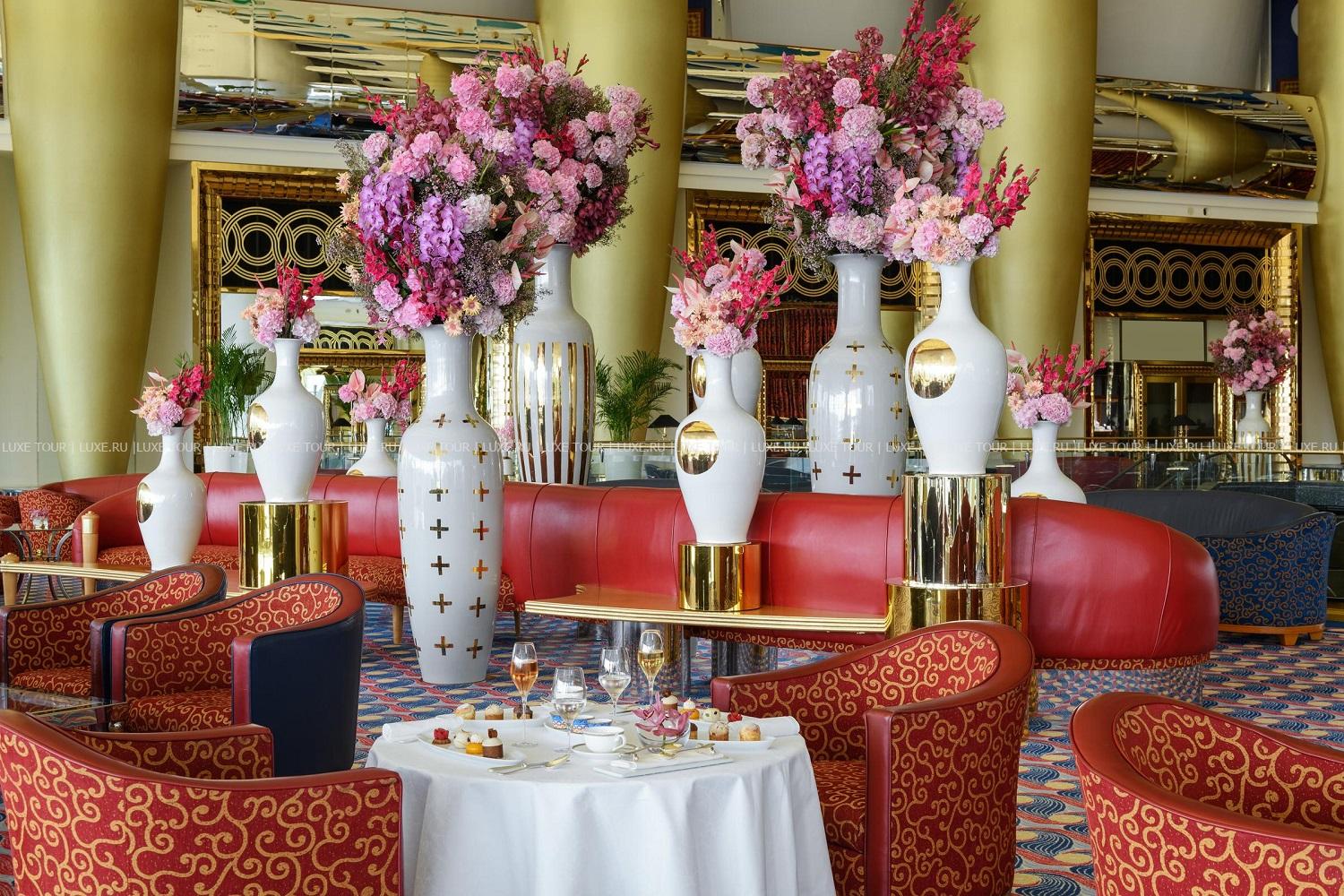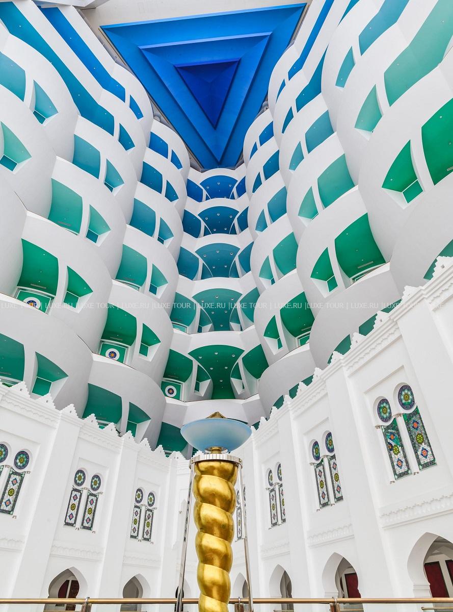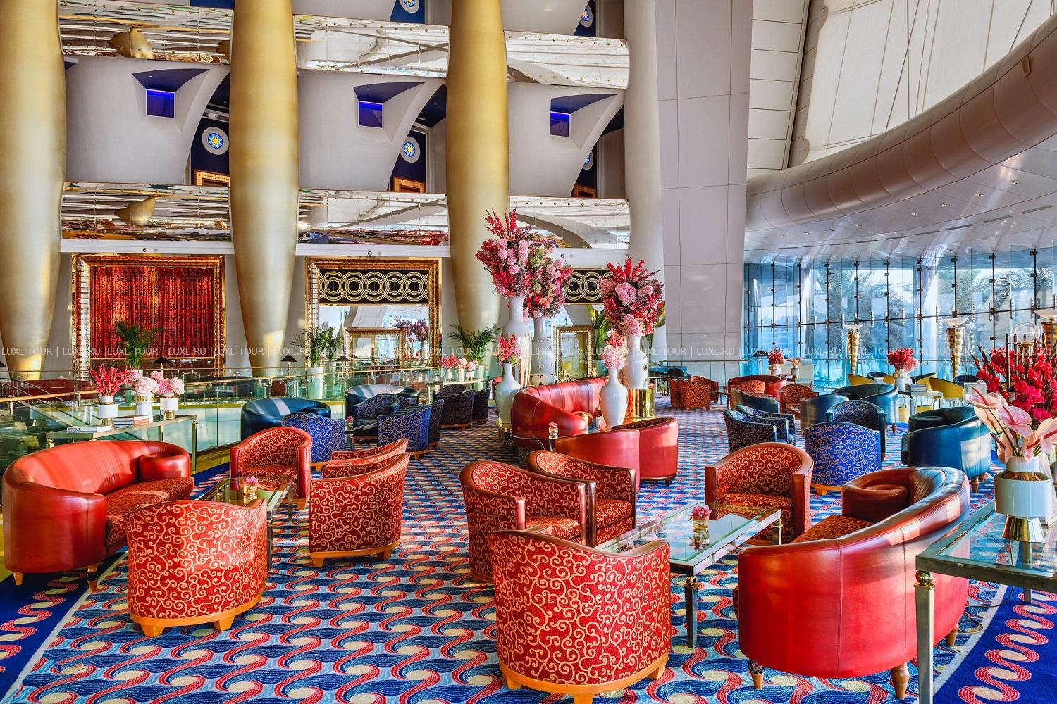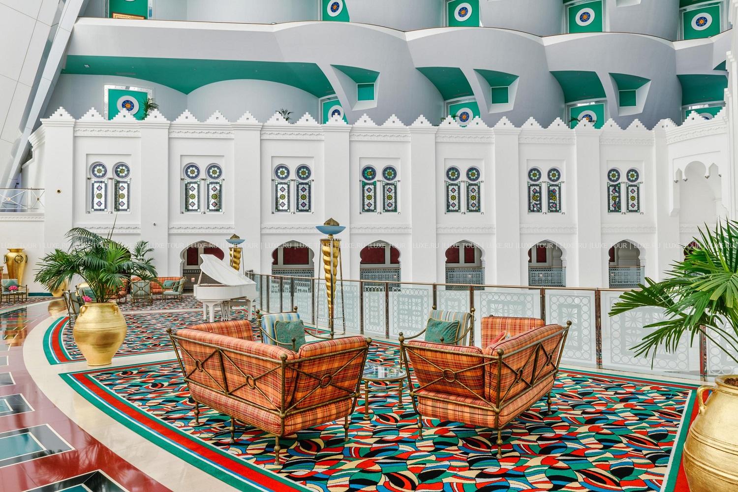 Среди сверкающих вод Персидского залива, на специально созданном острове расположился гигантский корабль высотой 321 м, идущий на всех парусах, а ночью светящийся разноцветными огнями, — это Jumeirah Burj Al Arab Dubai. Технологии и комфорт XXI века сочетаются здесь с блистательной роскошью арабского дворца: редкие сорта мрамора и искрящийся хрусталь, мебель из ценных пород дерева и изумительной красоты ковры, отделка из золота и подлинные произведения искусства. В двухуровневых номерах, оборудованных по самым современным технологиям, — изысканные интерьеры в восточном стиле, выдержанные в насыщенной цветовой гамме, с отделкой из дорогих сортов дерева, мрамора, великолепных тканей и золота, из панорамных, во всю стену, окон, открывается потрясающий вид на лазурную гладь моря. На территории Jumeirah Burj Al Arab Dubai есть открытый бассейн, предлагаются водные виды спорта, дайвинг, виндсерфинг, рыбалка, прогулки на яхтах, на вертолете, рядом находятся гольф-поля, теннисные корты.