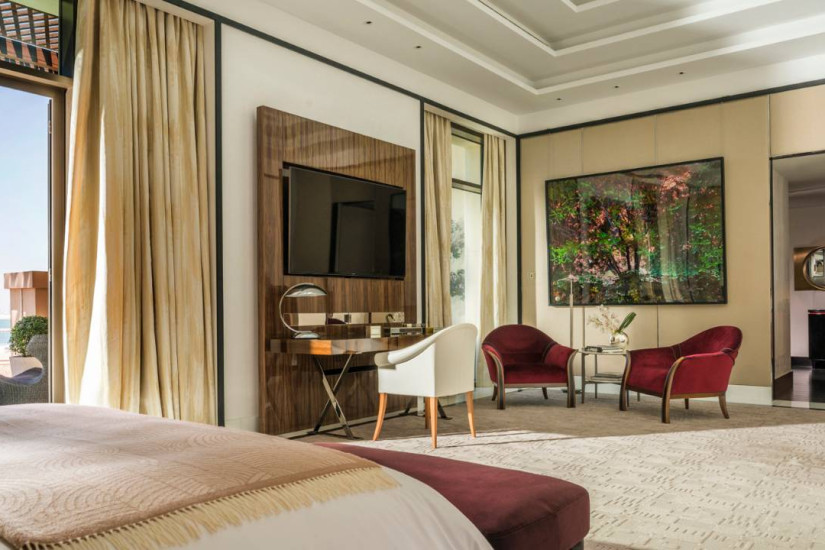 - 510 м2. Роскошный номер на 5 этаже, состоит из спальни с кроватью king-size, гостиной, столовой, кабинета, переговорной комнаты, тренажерного зала, ванной комнаты с ванной и отдельным душем, гостевой туалетной, террасы с панорамным видом на пляж Jumeirah и Персидский залив. Максимальное размещение - 3 взрослых или 2 взрослых+1 ребенок. Возможно присоединение второй и третьей спален.