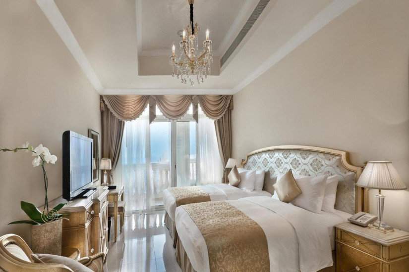 - В отеле 244 номера различных категорий, включая Superior 1 Bedroom Suites, Ocean 2 Bedroom Suites, Lagoon 2 Bedroom Suites, Ocean 2 Bedroom Suites with Pool, Superior 3 Bedroom Suites, Deluxe Three Bedroom Suites, Deluxe 3 Bedroom Penthouses, Deluxe 4 Bedroom Penthouses, Royal 5 Bedroom Villas, Imperial 5 Bedroom Villas. Номера впечатляют роскошными интерьерами, сочетающими великолепие восточного дворца и европейский шик: мраморные полы, колонны, богатые ткани, элегантная мебель в золотисто-кремовых тонах и тщательно подобранные аксессуары. С террас номеров открываются чудесные панорамные виды на лазурные воды лагуны Палм Джумейра, Персидский залив, рукотворный остров и ландшафты Дубаи. В каждом номере предусмотрена рабочая зона. Номера Suites выполнены в классическом итальянском стиле с преобладанием золотых и нежно-голубых оттенков, в пентхаусах и виллах преобладает дворцовая отделка с богатой позолотой и нежно-голубыми стилевыми решениями.
