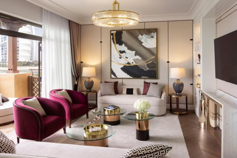 - 115 м2. Состоит из спальни с кроватью king-size, гостиной с обеденной зоной, ванной комнаты с ванной и тропическим душем, гардеробной, балкона с видом на Персидский залив, сады и территорию отеля. Гостям этих номеров предоставляется расширенный набор туалетных принадлежностей, неограниченный доступ в private lounges, а так же доступ в Wild Wadi Waterpark. Максимальное размещение – 3 взрослых или 2 взрослых + 2 ребенка.