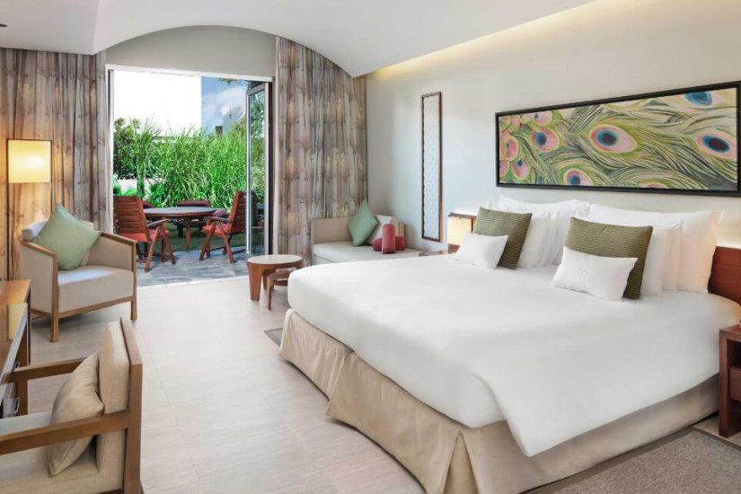 - 109 м2. Состоит из спальни с кроватью king-size или двумя кроватями twin, гостиной с зоной отдыха и обеденной зоной, гардеробной, ванной комнаты, балкона с видом на залив и пляж. Номера располагаются рядом с пляжем и бассейном. Максимальное размещение – 2 взрослых + 3 ребенка.