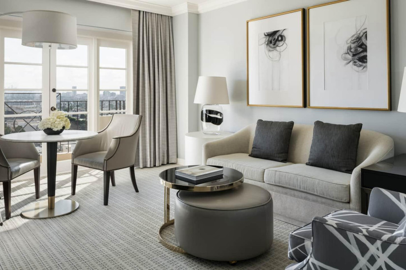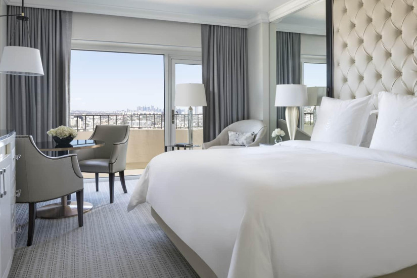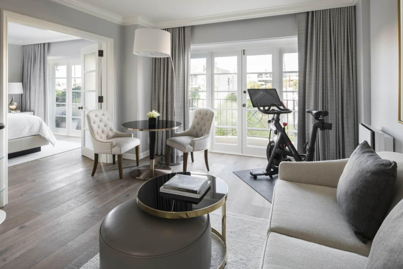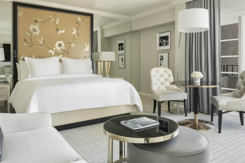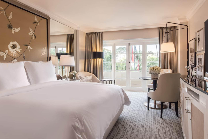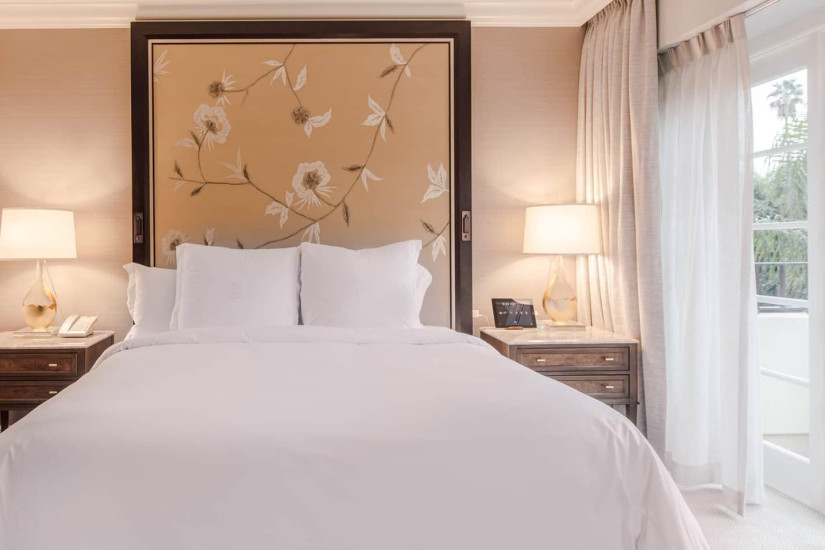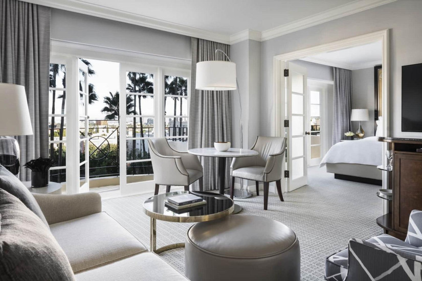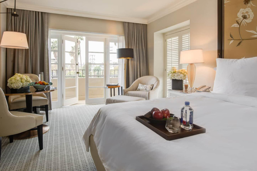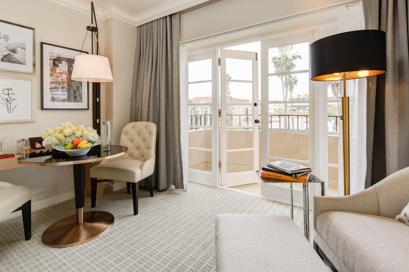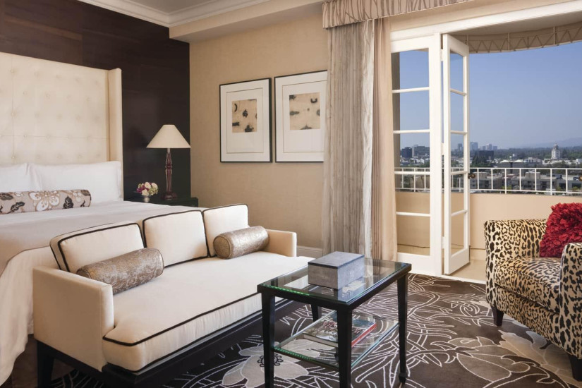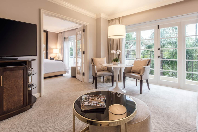 - 59 м2. Состоит из спальни с кроватью king-size или двумя кроватями twin, гостиной с диваном и рабочей зоной, гардеробной, ванной комнаты, балкона с видом на Беверли-Хиллз, Голливудские холмы, сад или вход в отель. Номера располагаются с 2 по 15 этажи. Максимальное размещение – 3 взрослых или 2 взрослых + 2 ребенка.