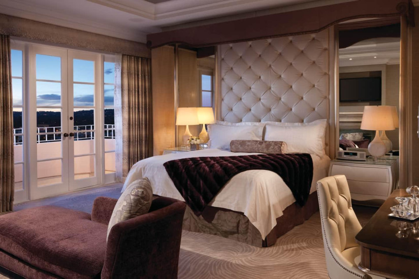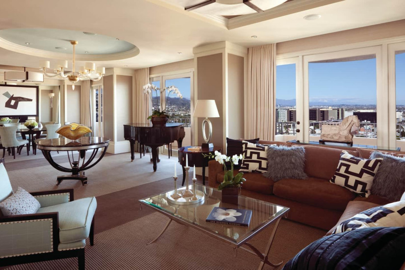 - 168 м2. Фешенебельный номер состоит из фойе, двух спален с кроватью king-size, гостиной с камином, столовой с обеденной зоной на 8 персон, кухни, гардеробной, двух ванных комнат с ванной и душем, гостевой ванной комнаты с душем, четырех балконов с панорамным видом на Лос-Анджелес и Беверли-Хиллз. Номера располагаются на 16 этаже. Максимальное размещение – 6 взрослых или 4 взрослых + 2 ребенка.