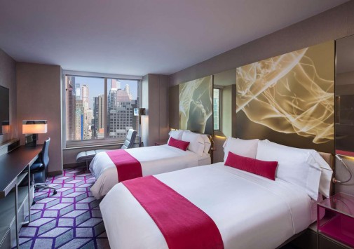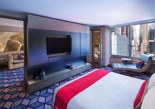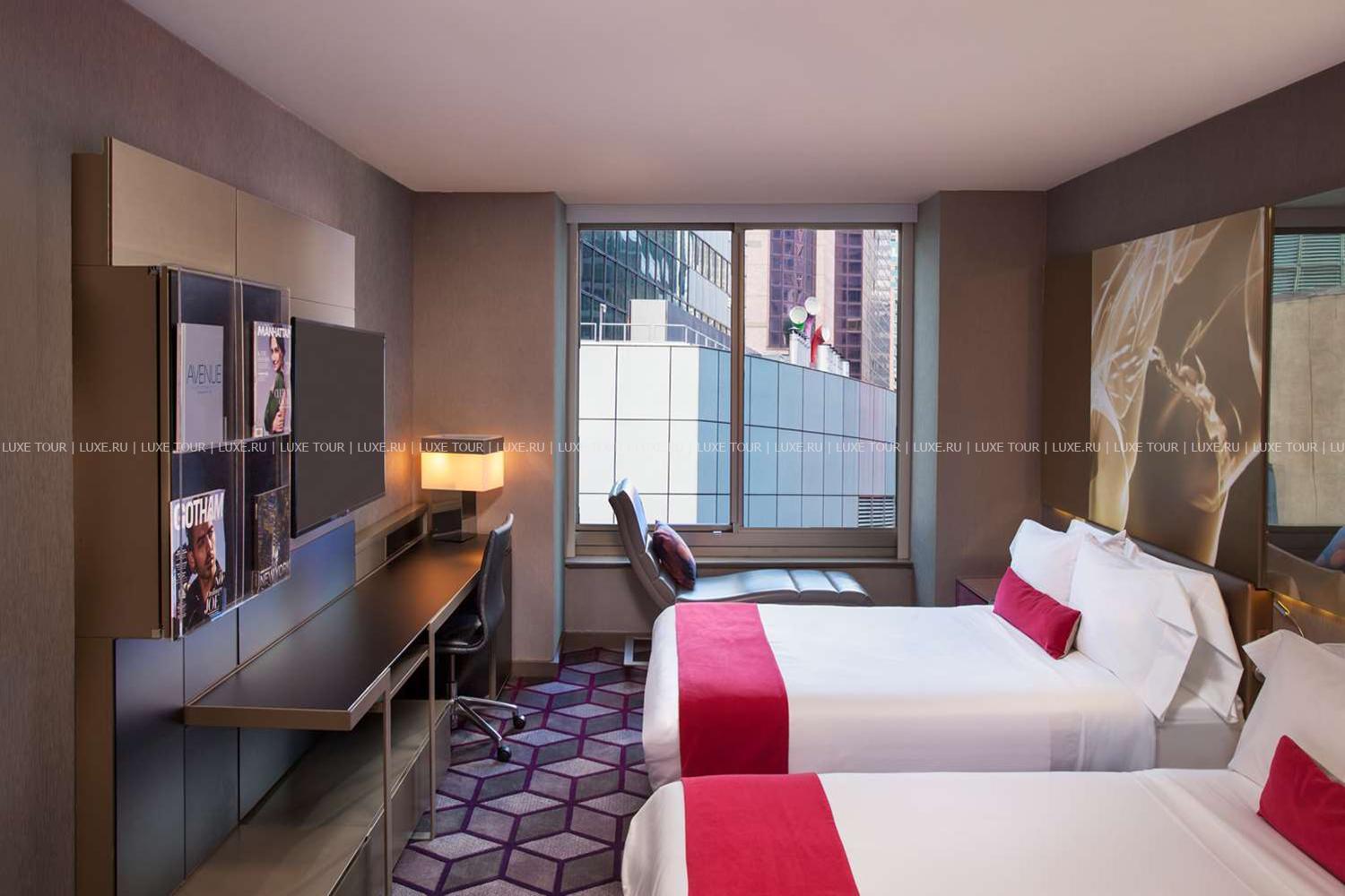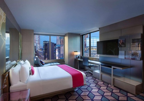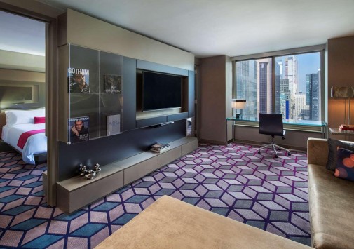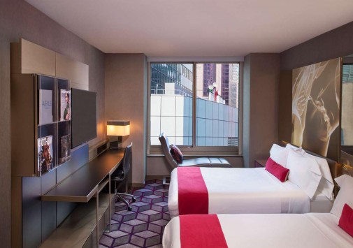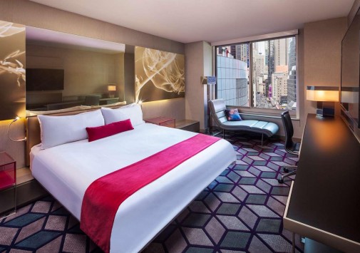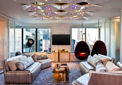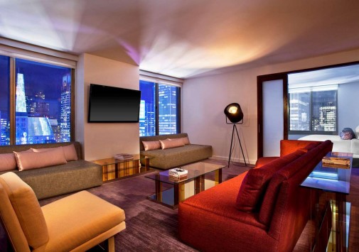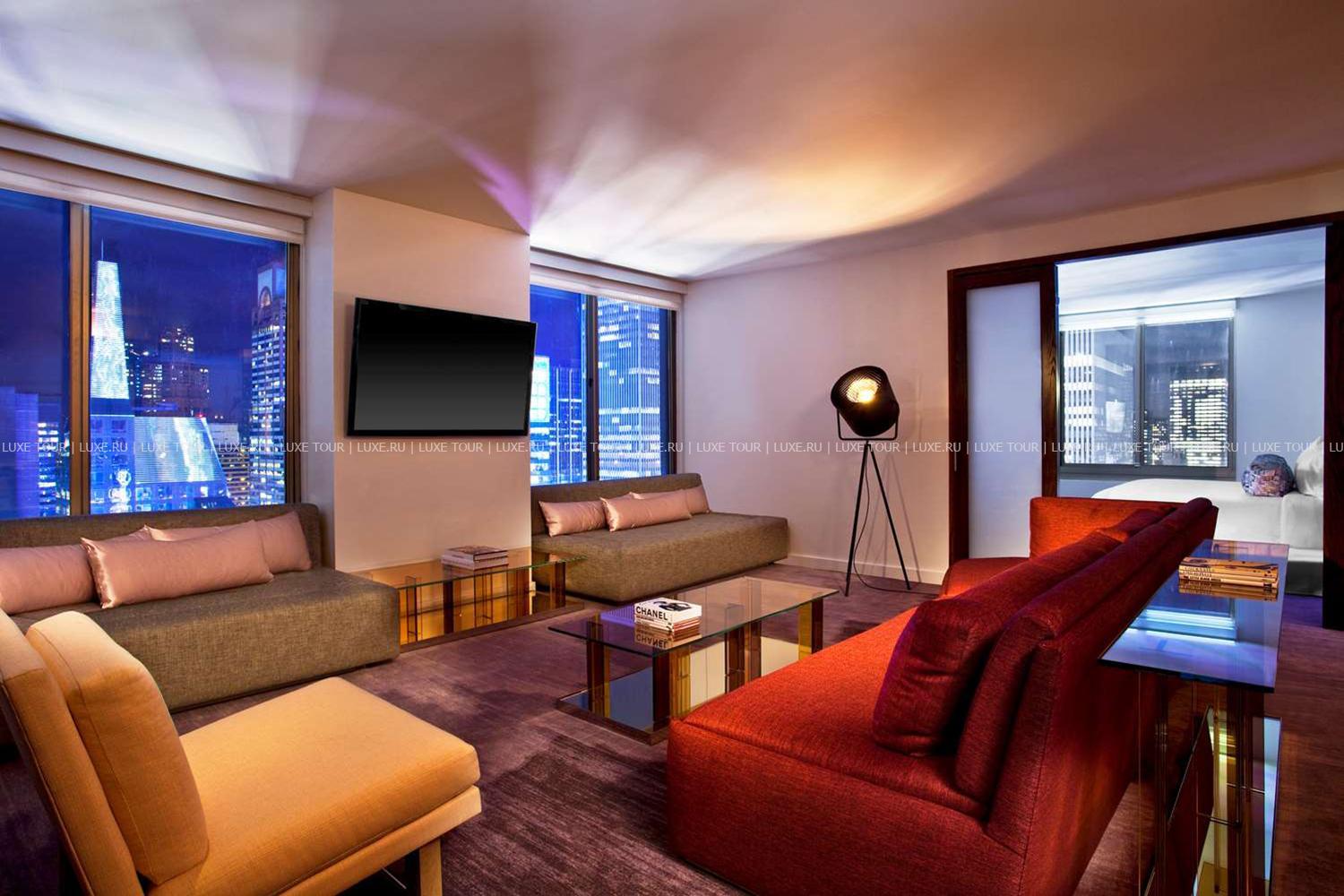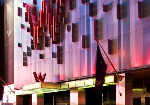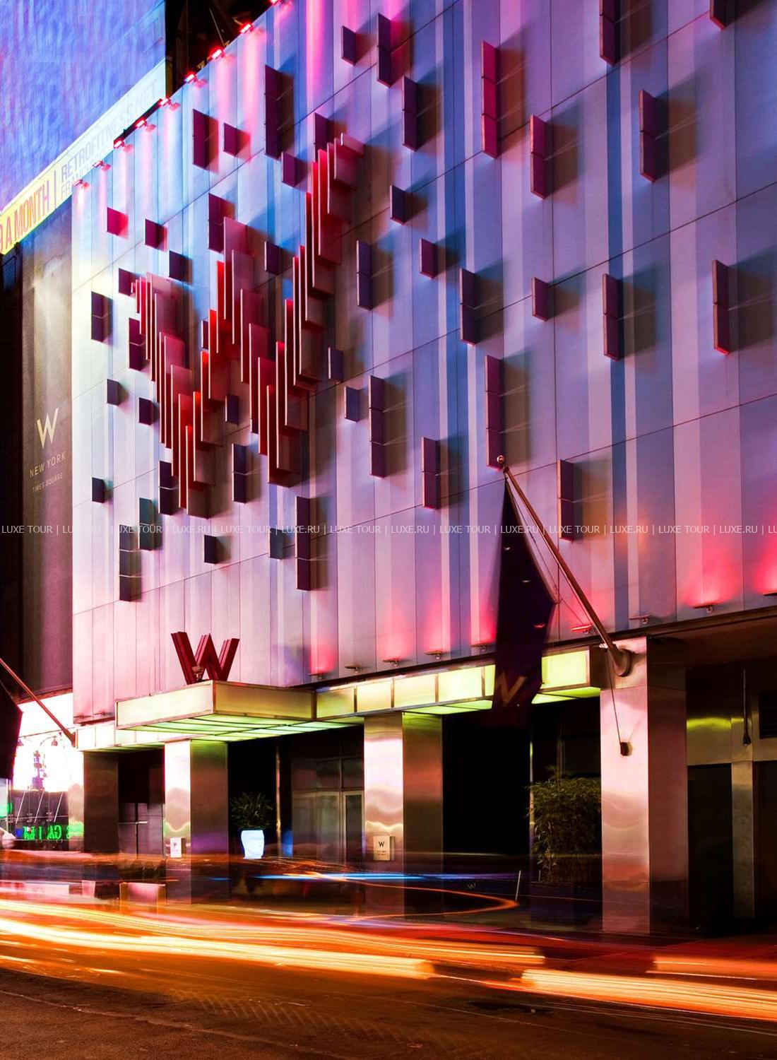 Отель расположен в центре города, на площади Таймс-сквер, на углу Бродвея и 47-й улицы Нью-Йорка, в 50 минутах езды от международного аэропорта им. Дж. Кеннеди. Представляет собой новое современное 57-этажное здание. Интерьеры отеля оформлены в уютных темных тонах с элегантной подсветкой, в холле отеля гостей встречает фонтан. Буква W выбрана для названия этой серии отелей не случайно: по мнению создателей проекта – с нее ( в английском языке) начинаются слова «теплый», «чудесный», «добро пожаловать». Из слов, начинающихся с той же буквы, состоит и название одной из главных служб отеля - Whatever you want, whenever you want it («Все, что угодно, всегда, когда угодно»). Отель предлагает своим гостям Spa-центр, 2 ресторана, конференц-залы, магазин подарков, обслуживание и даже товары для домашних животных.