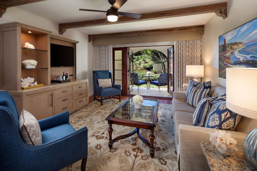 - 79 м2. Состоит из спальни с кроватью king-size, гостиной зоны с камином и зоной отдыха с диваном, двух ванных комнат (одна с ванной и отдельным душем, вторая – с душем), расположенной по периметру террасы с частичным видом на океан. Номера располагаются с 1 по 3 этажи. Максимальное размещение – 4 взрослых.