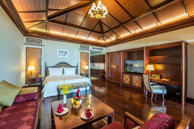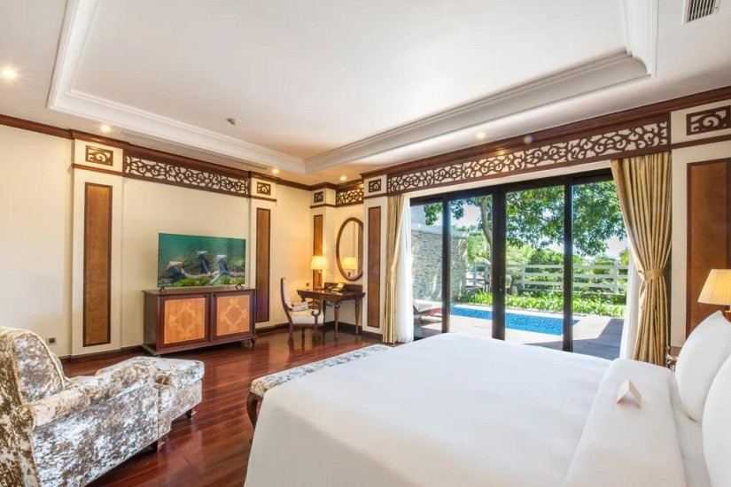 - В отеле виллы разных категорий. Виллы восхищают элегантными интерьерами в неоклассическом стиле с элементами вьетнамского декора: изящная мебель и отделка из ценных пород дерева, великолепные шелковые ткани. С балконов и террас открывается изумительный вид на живописные зеленые холмы, пышный тропический сад и лазурное море.