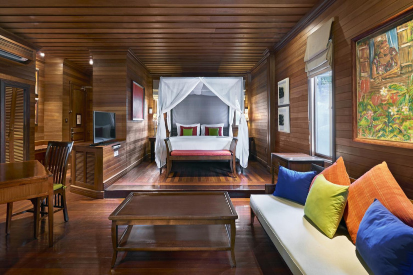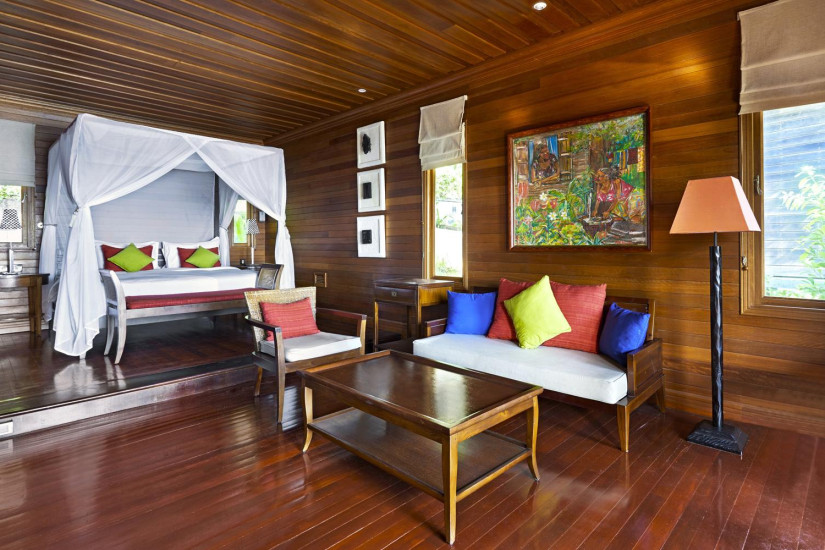 - 130 м2. Расположена рядом с океаном, на сваях у воды, состоит из спальни с кроватью king-size под пологом, гостиной зоны, ванной комнаты с джакузи и душем, террасы с видом на океан и бассейном.