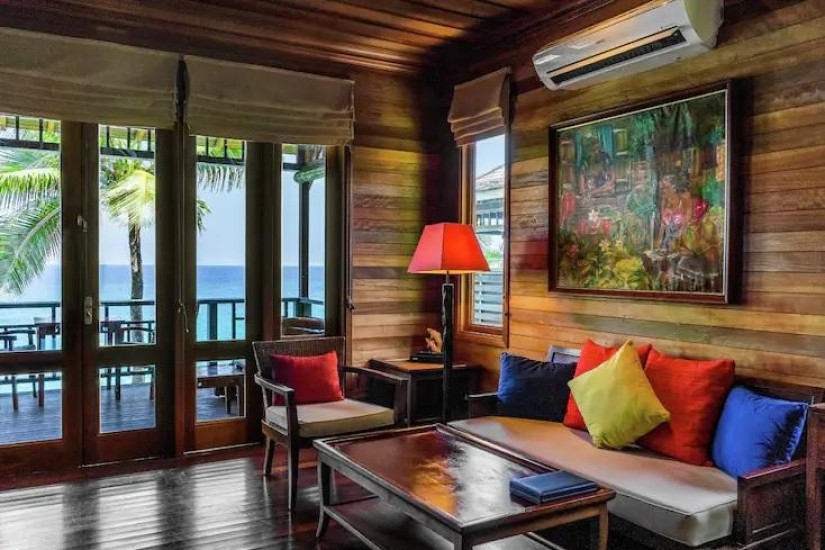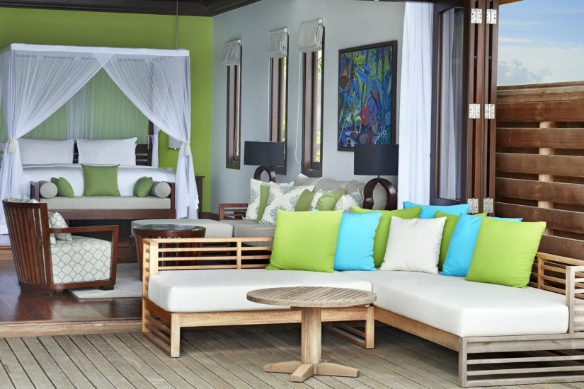 - 90 м2. Расположена рядом с пляжем, на сваях у воды, состоит из спальни с кроватью king-size под пологом, гостиной зоны, ванной комнаты с джакузи и душем, совмещенного балкона с видом на океан.
