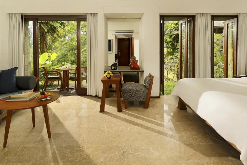 - В отеле 108 комфортабельных номеров различных категорий, включая Suite и Villa. В номерах - стильные интерьеры, с полами, выложенными плиткой, оригинальной удобной мебелью, изящными украшениями в индонезийских традициях, с балконов и террас открывается изумительный вид на пышные сады и речные долины.