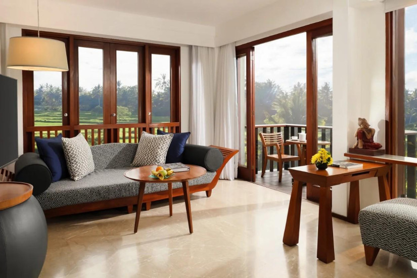 - 48 м2. Состоит из спальни с кроватью king- size или двумя кроватями twin, гостиной зоной, ванной комнаты, балкона с видом на долину реки или рисовые поля. Максимальное размещение - до 4 человек.