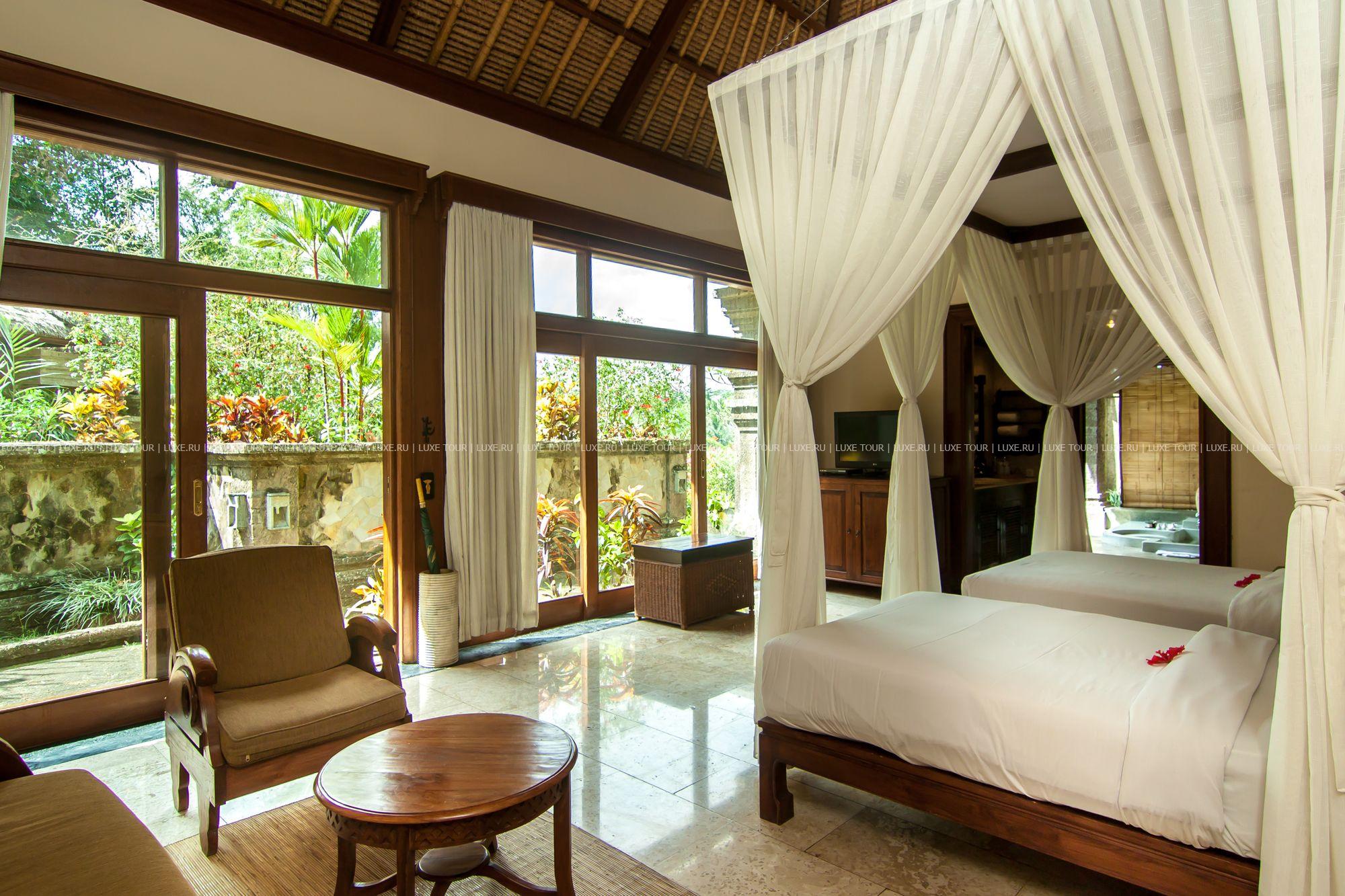 Расположенный среди зеленых холмов Убуда над долиной реки Оос отель выглядит как традиционная балийская деревня с соломенными крышами и завораживает своей атмосферой покоя и полного слияния с природой. Виллы, находящиеся на противоположных берегах реки, гармонично вписаны в ландшафт и украшены произведениями балийских искусств и ремесел: скульптурой, резьбой по дереву и камню. Основной концепцией отеля, открытого в 2004 году, является сохранение национальных традиций во всем.