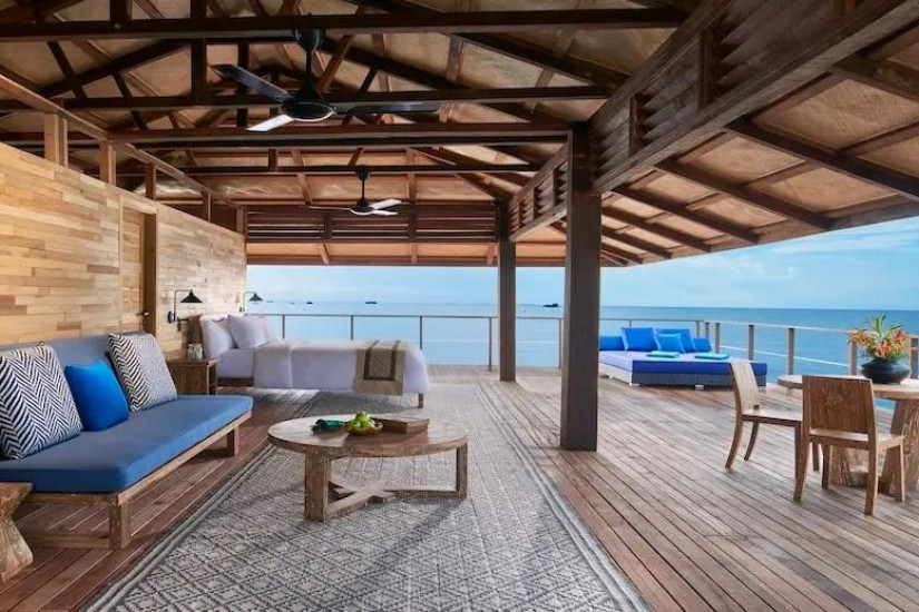 - 200 м2. Уникальная вилла открытого плана состоит из спальни с кроватью king-size, гостиной и обеденной зон, ванной комнаты, душа на открытом воздухе, террасы с зоной отдыха, обеденной зоной, спуском в воду и панорамным видом на море. Вилла расположена на деревянной платформе над водой, в отдалении от берега. Максимальное размещение – 2 человека.