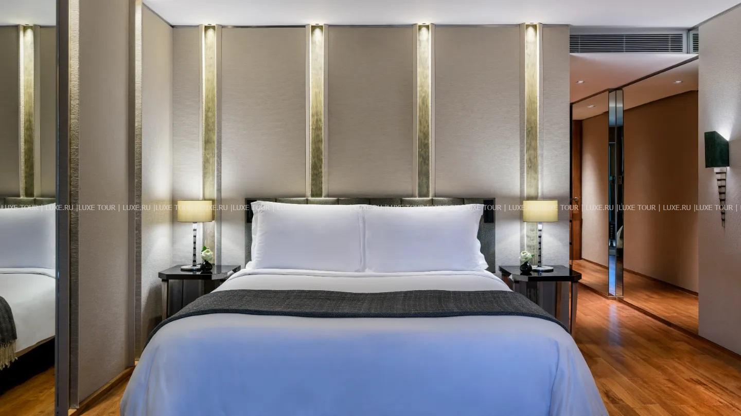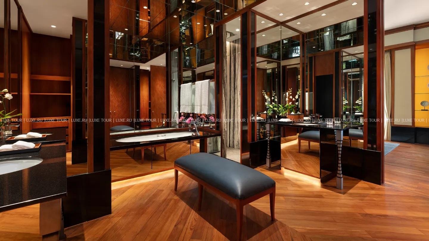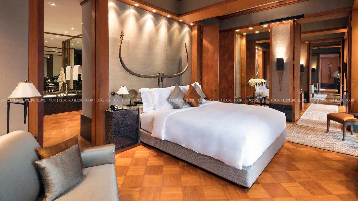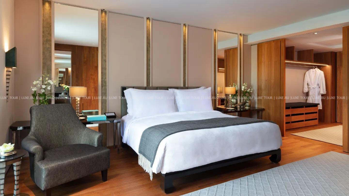 90 м2. Состоит из спальни с кроватью king-size, гостиной, обеденной зоны, гардеробной, ванной комнаты. Вид на бассейн. Максимальное размещение — 3 человека.