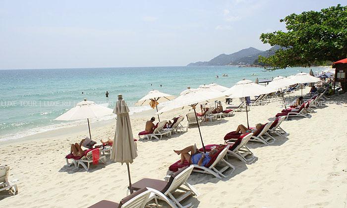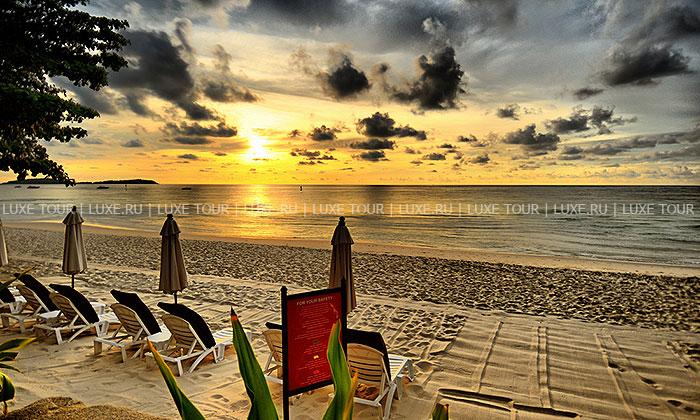 Отель расположен у песчаного пляжа с шезлонгами и зонтиками от солнца.