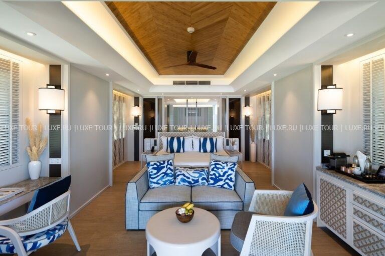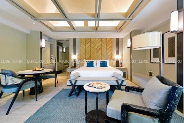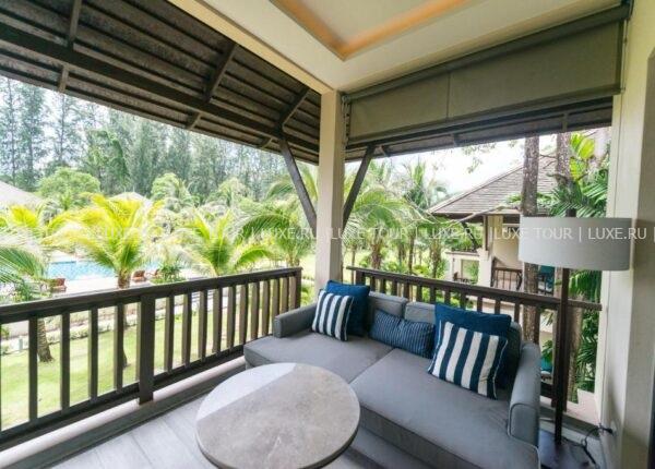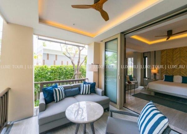 60 м2. Двухуровневый номер, состоит из спальни, гостиной зоны, ванной комнаты, просторной меблированной террасы. На нижнем этаже есть собственное патио и прямой выход к оздоровительному бассейну.