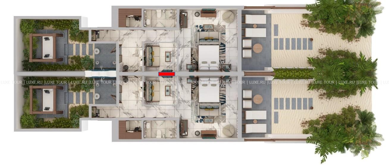 Соединенные две Beach Villa. Максимально размещение - 4 взрослых + 2 ребенка или 6 взрослых.