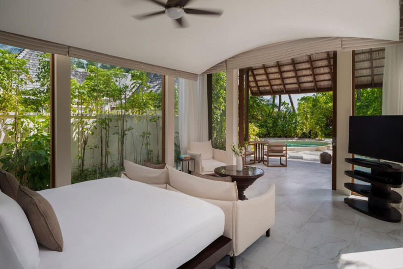 - 300 м2. Расположена на берегу, состоит из двух спален с большой кроватью king и двумя кроватями twin в небольшой детской спальне, двух ванных комнат, в том числе душ на открытом воздухе, террасы с зоной отдыха, бассейном и выходом к пляжу. Вторая спальня расположена в отдельном павильоне.