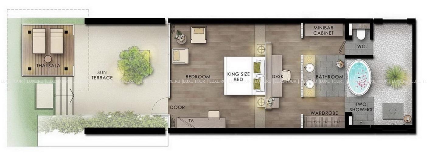- 95 м2. Состоит из спальни с кроватью king-size, гостиной зоны, гардеробной, ванной комнаты, террасы с павильоном для отдыха, собственного сада. Максимальное размещение – 2 человека.
