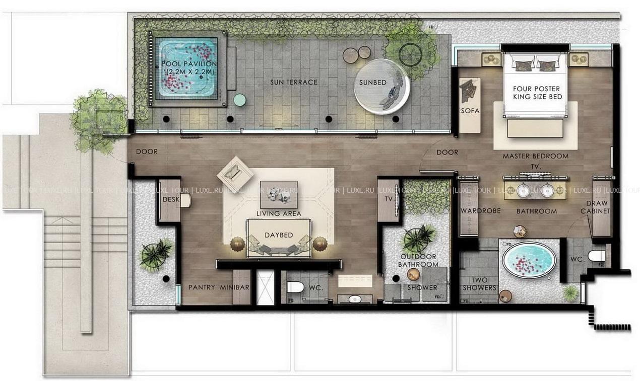 - 120 м2. Состоит из спальни с кроватью king-size, гостиной зоны, ванной комнаты в кондиционированном саду, террасы с бассейном и павильоном для отдыха, собственного сада. Максимальное размещение – 2 человека.