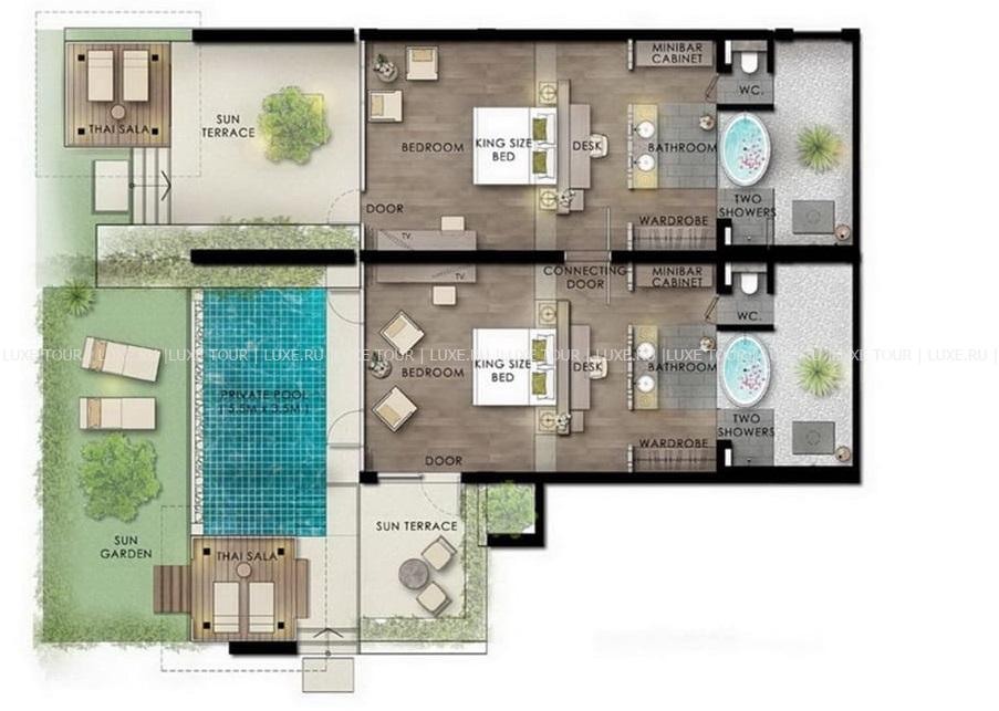 - 215 м2. Состоит из двух спален с кроватями king-size, ванных комнат, меблированной террасы с бассейном, террасы с павильоном для отдыха, собственного сада. Максимальное размещение – 4 человека.