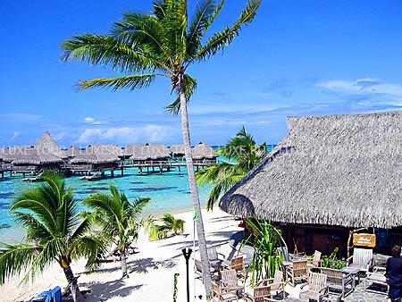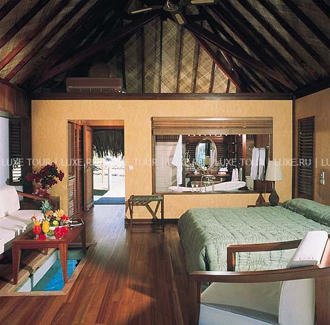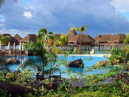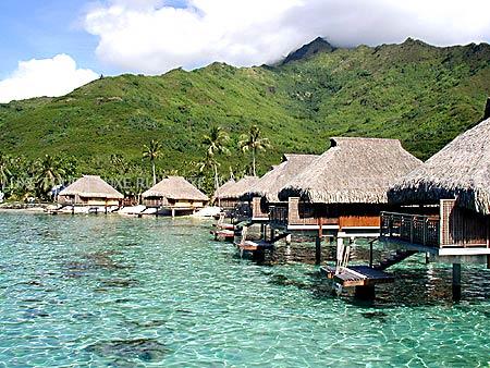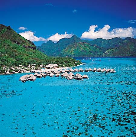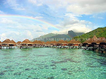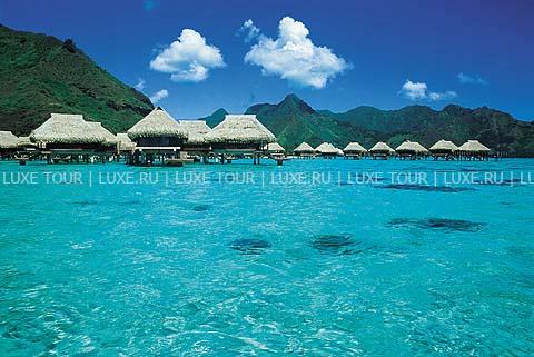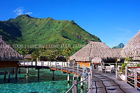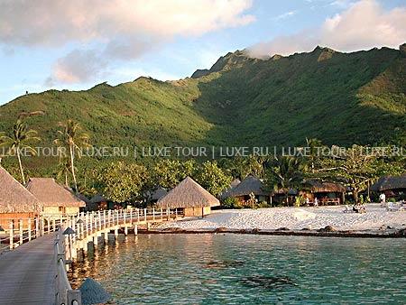 Из окон традиционных для этой части света деревянных бунгало, расположенных и на воде, и на суше, открываются восхитительные виды на вулканические вершины и коралловый барьерный риф. Необычные впечатления на гостей, остановившихся в бунгало на воде, производят шелест волн и разноцветные рыбки под прозрачными полами.
