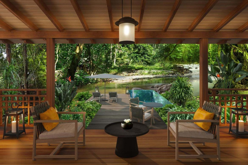 - 109-125 м2. Расположен в главном здании, состоит из спальни, гостиной с обеденной зоной, ванной комнаты с ванной и душем, веранды с видом на тропический лес.