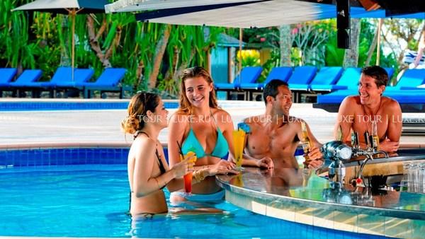 В баре, расположенном прямо в бассейне, можно выпить тропический коктейль или бокал холодного пива.
