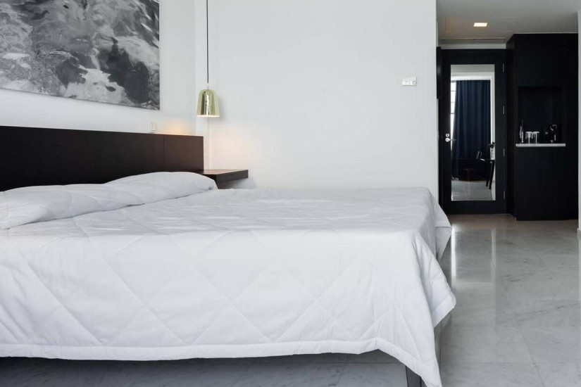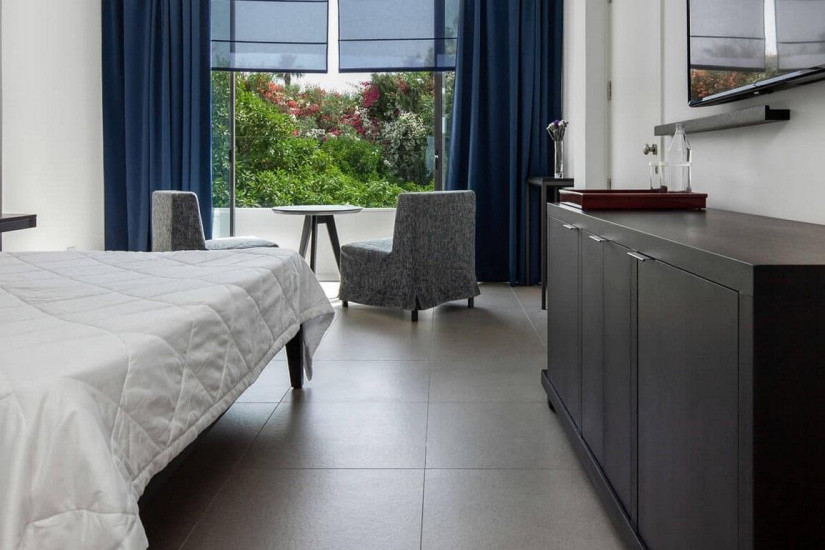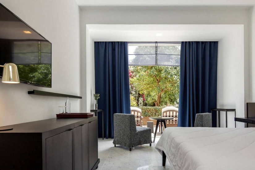 - 47 м2 + 44 м2 – терраса на крыше. Шикарный номер открытого плана, расположенный в саду у самого моря (Kyma – переводится как волна), состоит из спальни с зоной отдыха, ванной комнаты, террасы видом на море, выходящей на лужайку с лежаками king-size, террасы на крыше (куда ведет внешняя лестница) с панорамным видом на море и город. Максимальное размещение – 2 взрослых + 1 ребенок + 1 ребенок в детской кроватке. Возможны совмещенные номера.