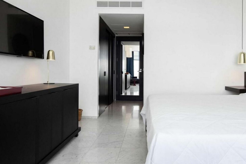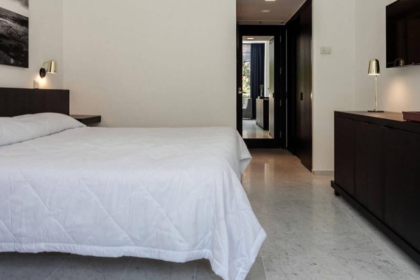 - 28 м2. Состоит из спальни, отделанной мрамором ванной комнаты с ванной, из панорамных, во всю стену окон открывается вид на сады и город. Возможны объединение со смежными номерами и дополнительная кроватка для детей.