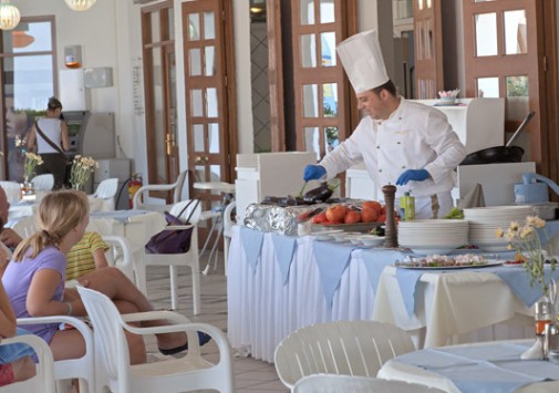 Для маленьких гостей работает детский клуб Aldy для детей от 4 до 12 лет, где предлагаются всевозможные развлекательные программы, детский ресторан Aldy со специальным меню, есть игровая площадка и игровая комната. Разнообразие ресторанов и баров отеля, где возможно обслуживание по системе All Inclusive, способно удовлетворить самый взыскательный вкус: в основном ресторане предлагается разнообразие блюд интернациональной кухни, в таверне Artemis можно отведать блюда традиционной греческой кухни, ресторан Fontana Amorosa специализируется на деликатесах из морепродуктов. В Snack Bar, ресторане-баре на пляже и пиццерии подаются различные горячие и холодные закуски, пицца, а также всевозможные напитки. В кафе Ouzeri представлен большой выбор греческих и импортных напитков, а также закусок, выпечки, десертов и свежих фруктов, в центральном баре и баре у бассейна — напитки на любой вкус.