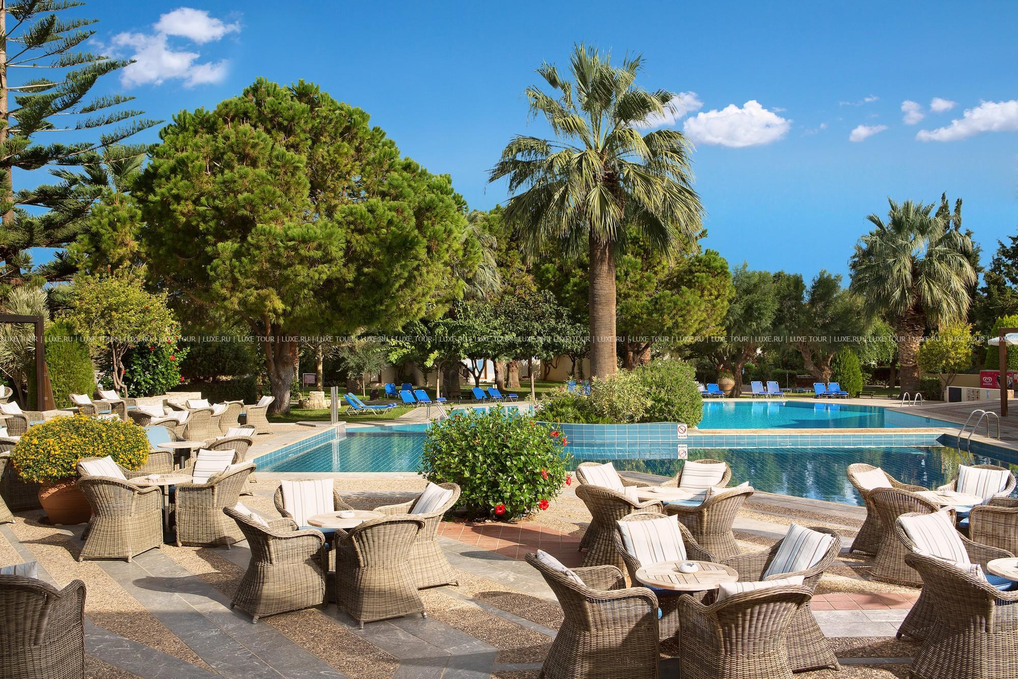 Невысокие белоснежные здания Cretan Malia Park Греция, построенные в традиционном критском стиле, окружены экзотическими деревьями, цветами и пышной зеленью уникального ботанического сада. Уютные элегантные номера и бунгало оборудованы с современным комфортом, с их балконов и террас открываются изумительные виды на лазурное море и чудесные сады. Также на обширной территории Cretan Malia Park Греция находится живописный пляж с центром водного спорта, большой центральный бассейн и бассейн-река, детские бассейны и клубы, предлагается большое разнообразие спортивных развлечений. Рестораны и бары отеля представляют широкий выбор блюд и напитков, и каждый вечер здесь проходят яркие фольклорные шоу, тематические ужины и развлекательные программы.