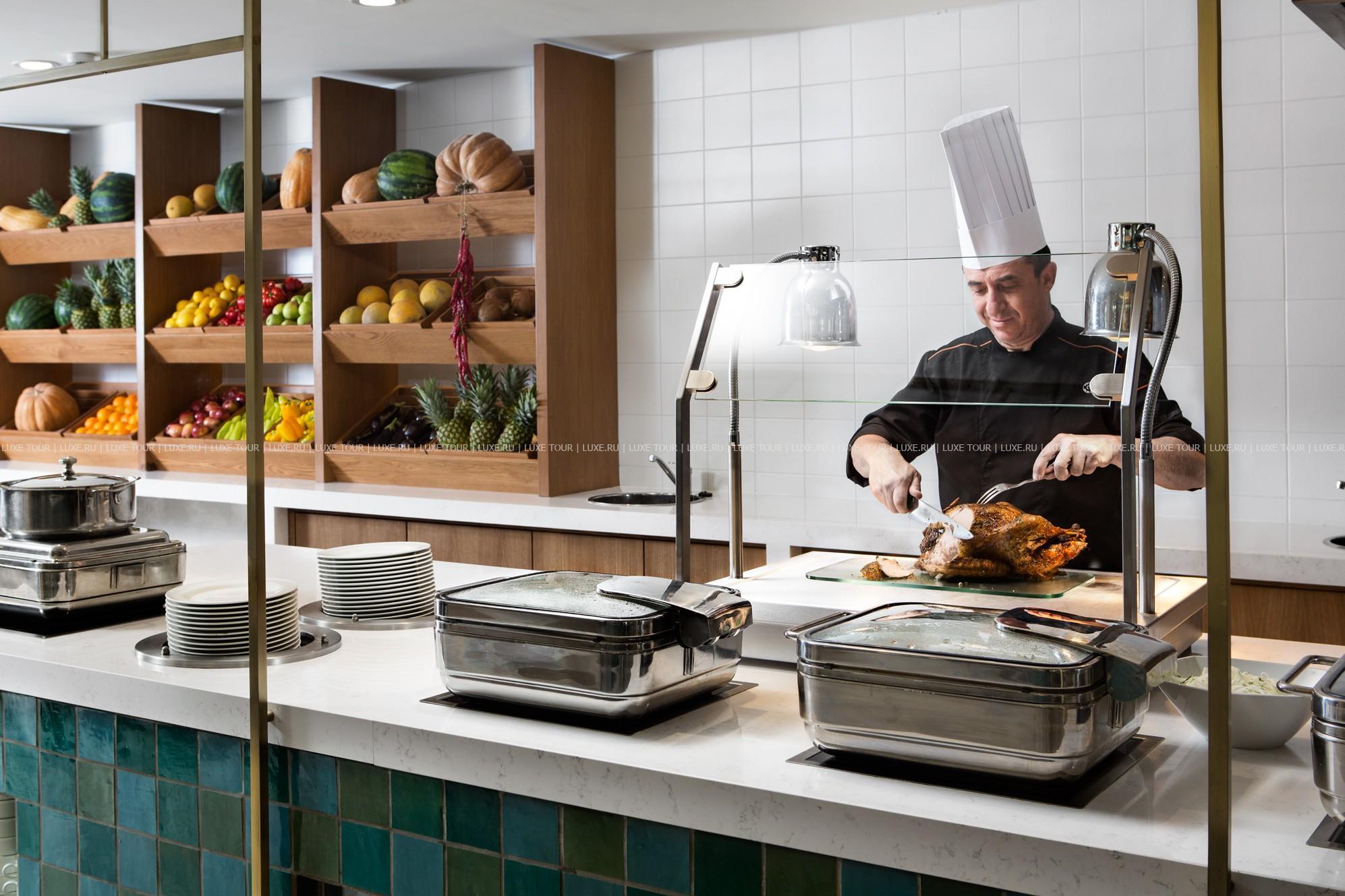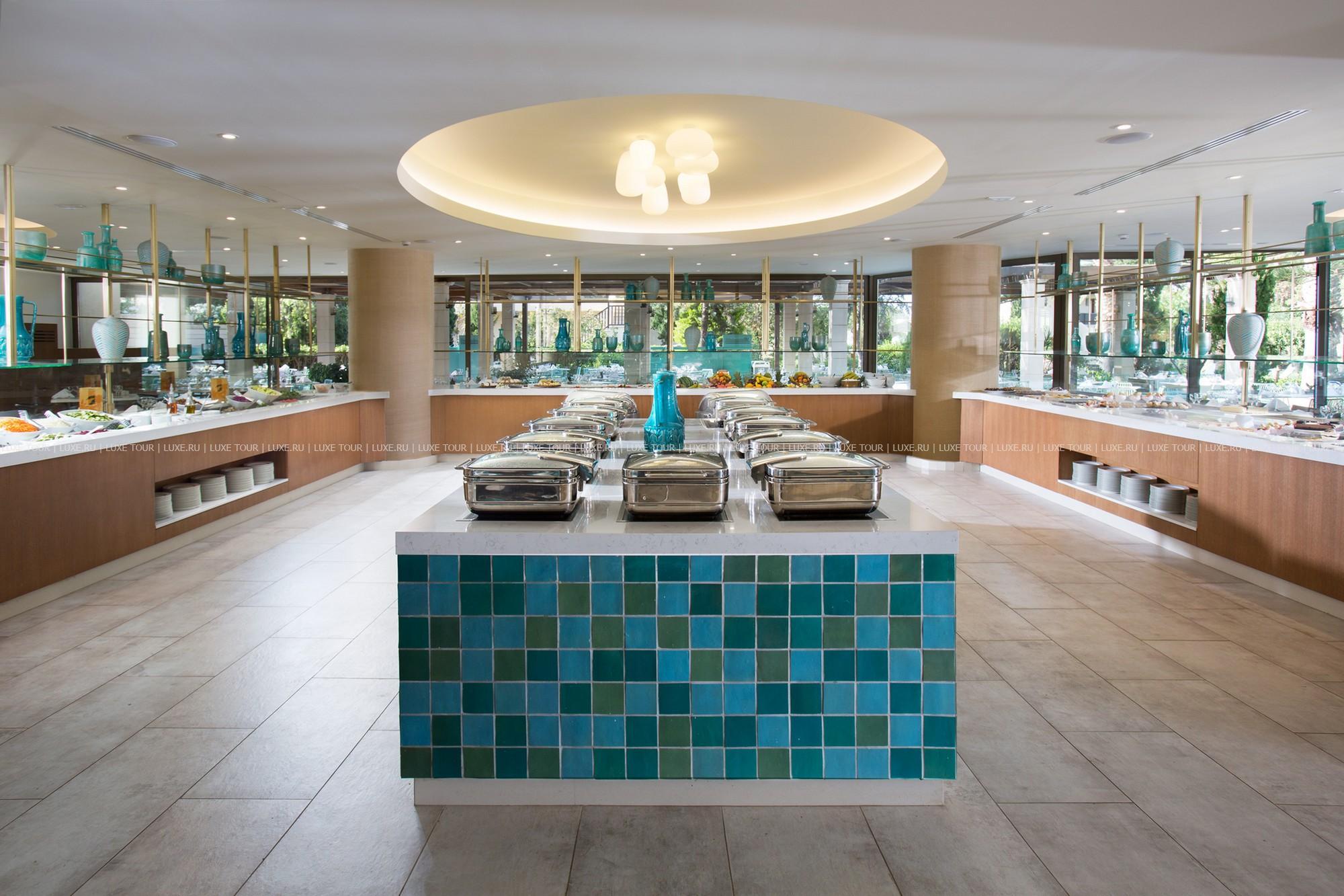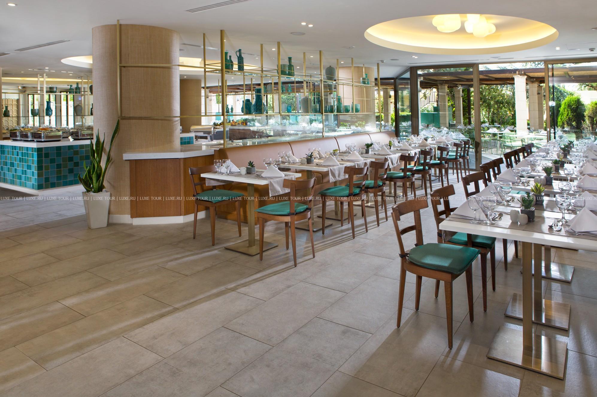 В главном ресторане отеля предлагаются богатые буфеты блюд греческой и интернациональной кухонь, а также устраиваются тематические ужины: греческий, средиземноморский, итальянский и азиатский вечера, вечер омаров, барбекю, дегустации вин и т.д.