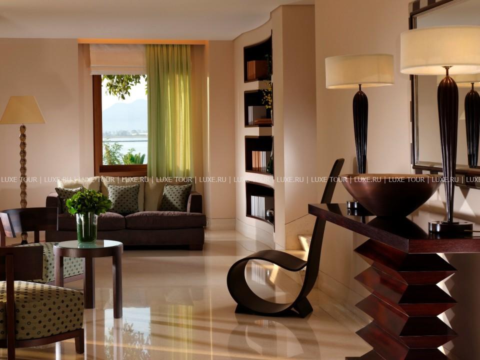 Отель расположен на восточном побережье полуострова Пелопоннес, в курортном городе Напфлион, на берегу живописного залива, в нескольких минутах ходьбы от исторического центра города. Гости могут пользоваться также некоторыми услугами соседнего отеля Nafplia Palace, который расположен в известном старинном заме Akronafpia. Недалеко от отеля находится старинная крепость Palamidi, в 15 минутах езды — древний город Mycenae, в 25 минутах езды — построенный в XIV веке театр Epidaurus, в котором каждое лето проходит фестиваль классической драмы и музыки. В 2 часах езды от отеля находится древняя Олимпия, колыбель Олимпийских игр. Amphitryon — небольшой современного стиля комплекс, интерьеры которого недавно были полностью обновлены. С террас отеля открывается вид на море и соседний островок Бурци с его знаменитой средневековой крепостью. В отеле есть конференц-зал, 2 ресторана, бар, комната отдыха с камином, библиотекой и баром, вертолетная площадка.