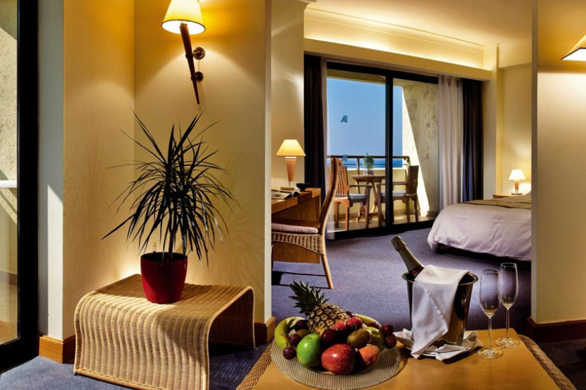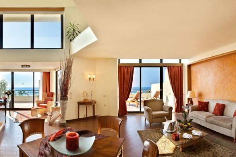 - 92 м2, двухэтажный номер с видом на море. На первом уровне (60 м2) находится гостиная с обеденной зоной, ванная комната; на втором уровне (32 м2) - спальня, ванная комната. В номере имеется балкон. Максимальное размещение - 2 человека.