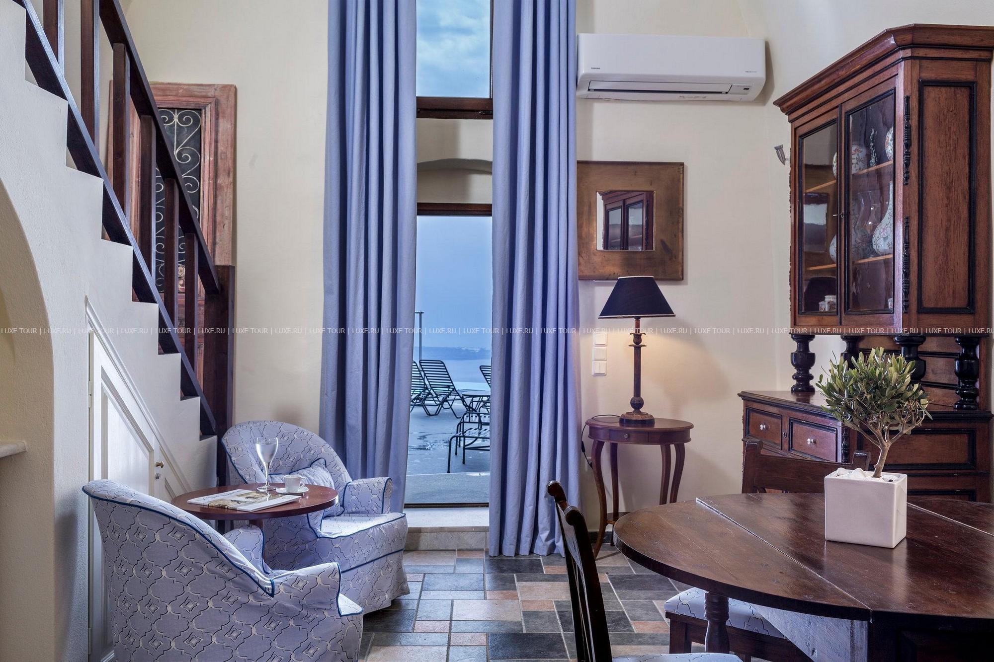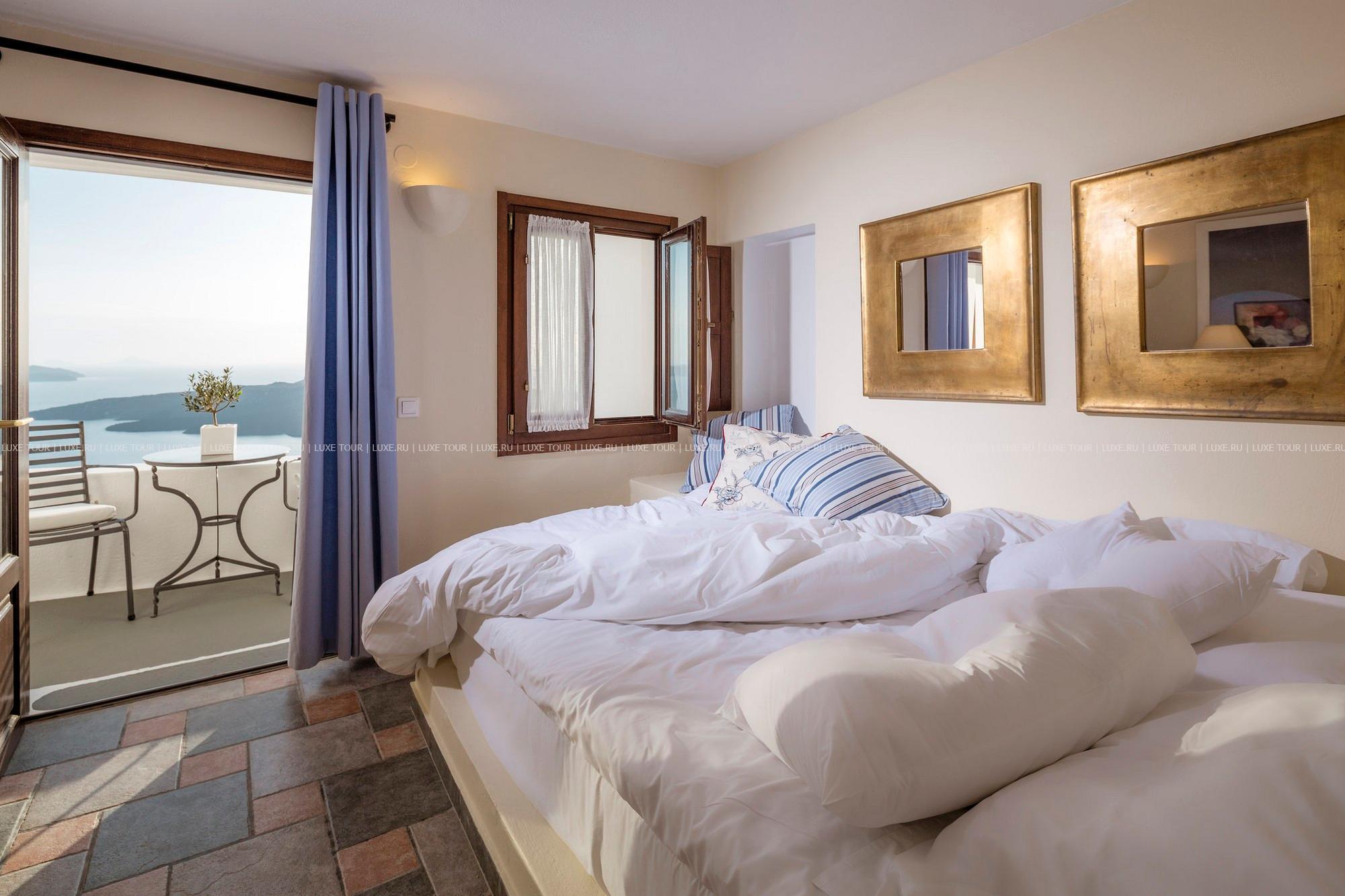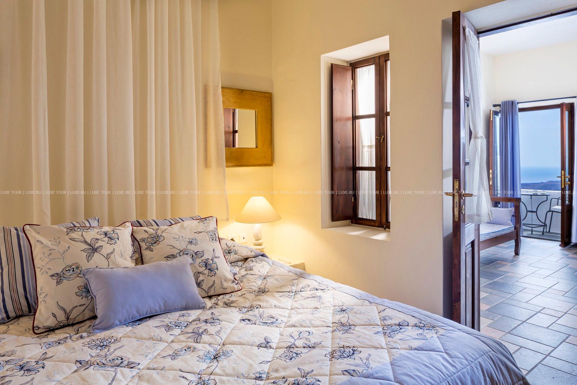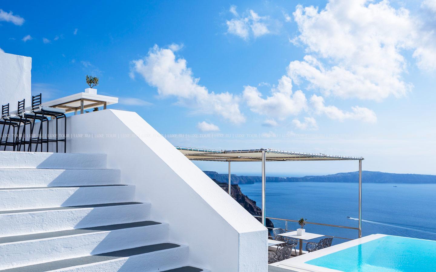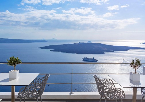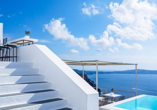Отель расположен в столице острова Санторини — городе Фира, в 100 метрах от главной площади, в непосредственной близости от фуникулера, спускающегося к пляжу, в 8 км от аэропорта. Комплекс находится на прибрежной скале, с которой открывается вид на море, вулканический остров и знаменитые «солнечные закаты Санторини». В небольшом уютном отеле всего 10 номеров, он построен в 1997 году в традиционном средиземноморском стиле: белоснежное здание с многочисленными арками. В отеле есть собственный массажный кабинет, большой открытый бассейн, уютный ресторан и бар.