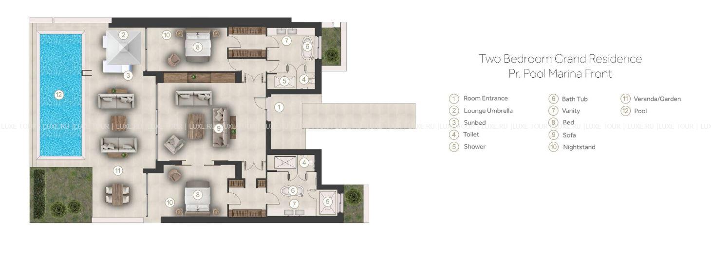 - 160 м2. Состоит из двух спален, гостиной с обеденной зоной, гардеробной, двух ванных комнат, частного сада, террасы с бассейном, зоной отдыха. обеденной зоной и видом на море гавань. Номера расположены рядом с гаванью. Максимальное размещение – 4 взрослых + 1 ребенок.